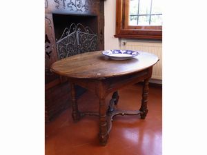 h cm 74x110x75 XVIII secolo piano di forma ovale, base con gambe tornite riunite da traverse sagomate disposte [..]