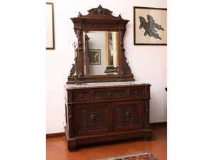 toielette h cm 80x110x56, specchiera cm 110x100 (2) XIX/XX secolo intagliata a grottesche, piano in marmo grigio, [..]