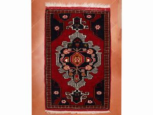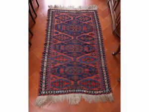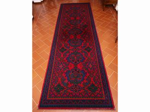 cm 420x140 Manifattura europea, prima metà del XX secolo campo rosso con motivi geometrici nei toni del turchese, [..]