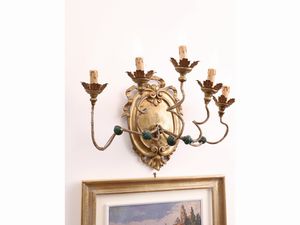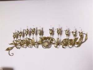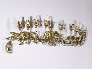 h cm 145x90 XIX secolo sei bracci pieni a doppia voluta con bobeche a coppa smerlata, sormontato da trionfo di [..]
