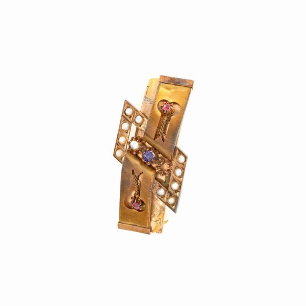 Antica spilla in oro basso, pietre sintetiche e perline