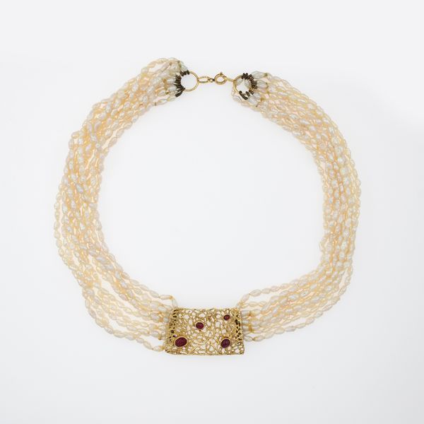 Collana a 10 fili di perle di fiume centrale e chiusura in oro giallo 18kt e rub [..]