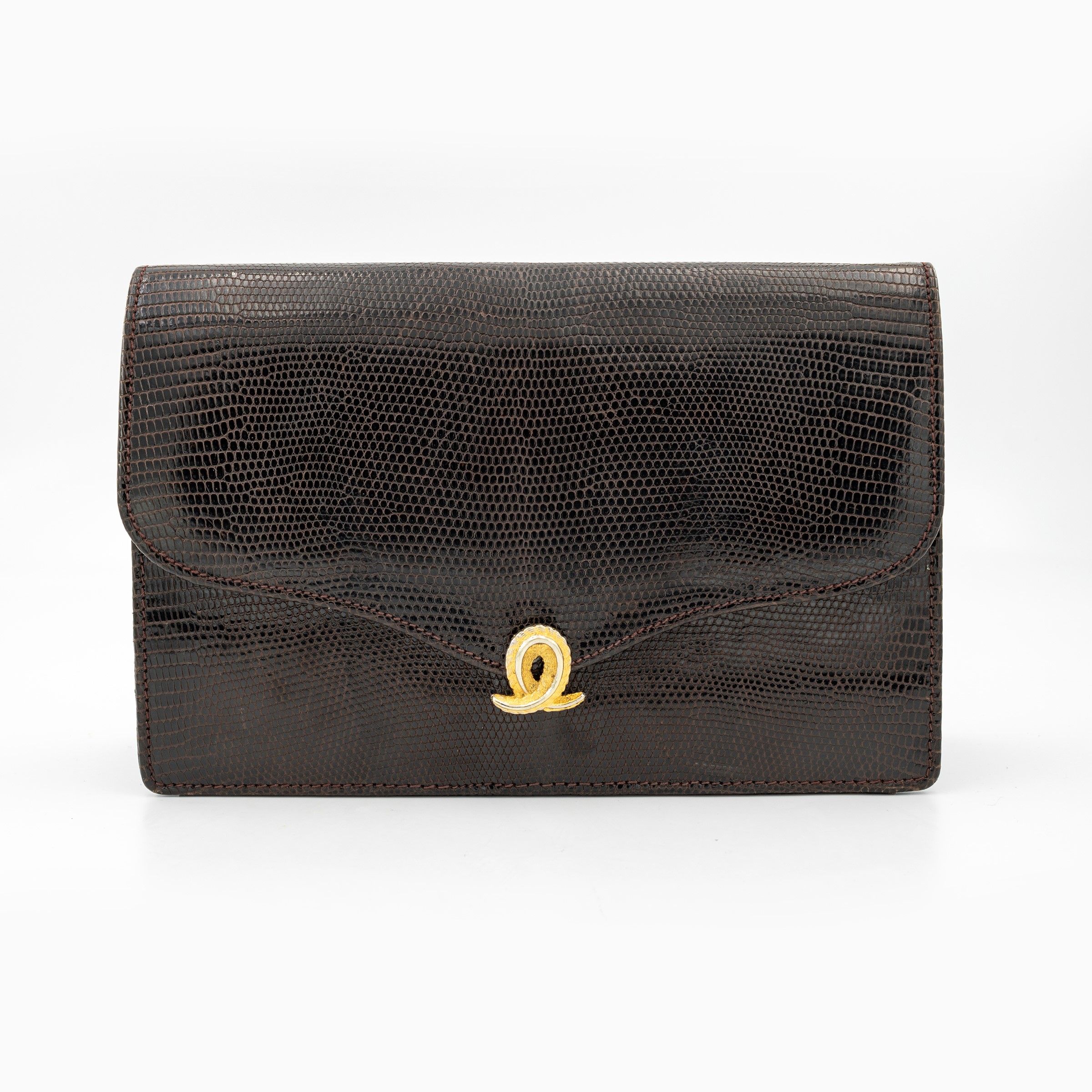 in pelle esotica, finiture dorate, interno in pelle ad uno scomparto con due tasche, chiusura a a scatto