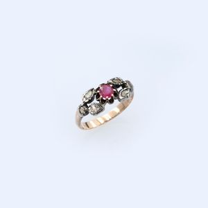 primi '900 realizzati in pietra lavica, corallo e onice montato a spilla su argento e strass, misure diverse, [..]