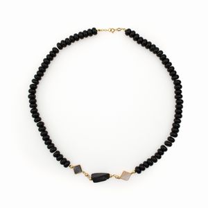 Collana in oro giallo 18kt onice nero, madreperla e pietra lavica