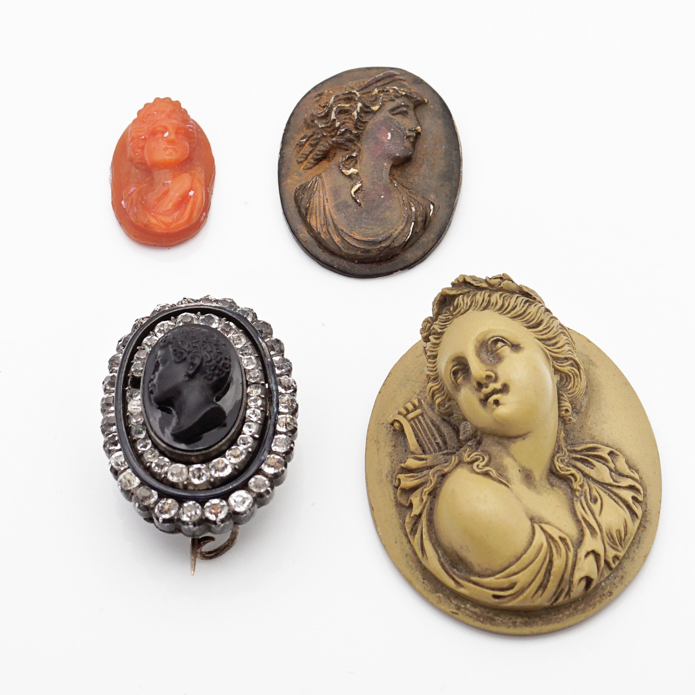 primi '900 realizzati in pietra lavica, corallo e onice montato a spilla su argento e strass, misure diverse, lievi difetti