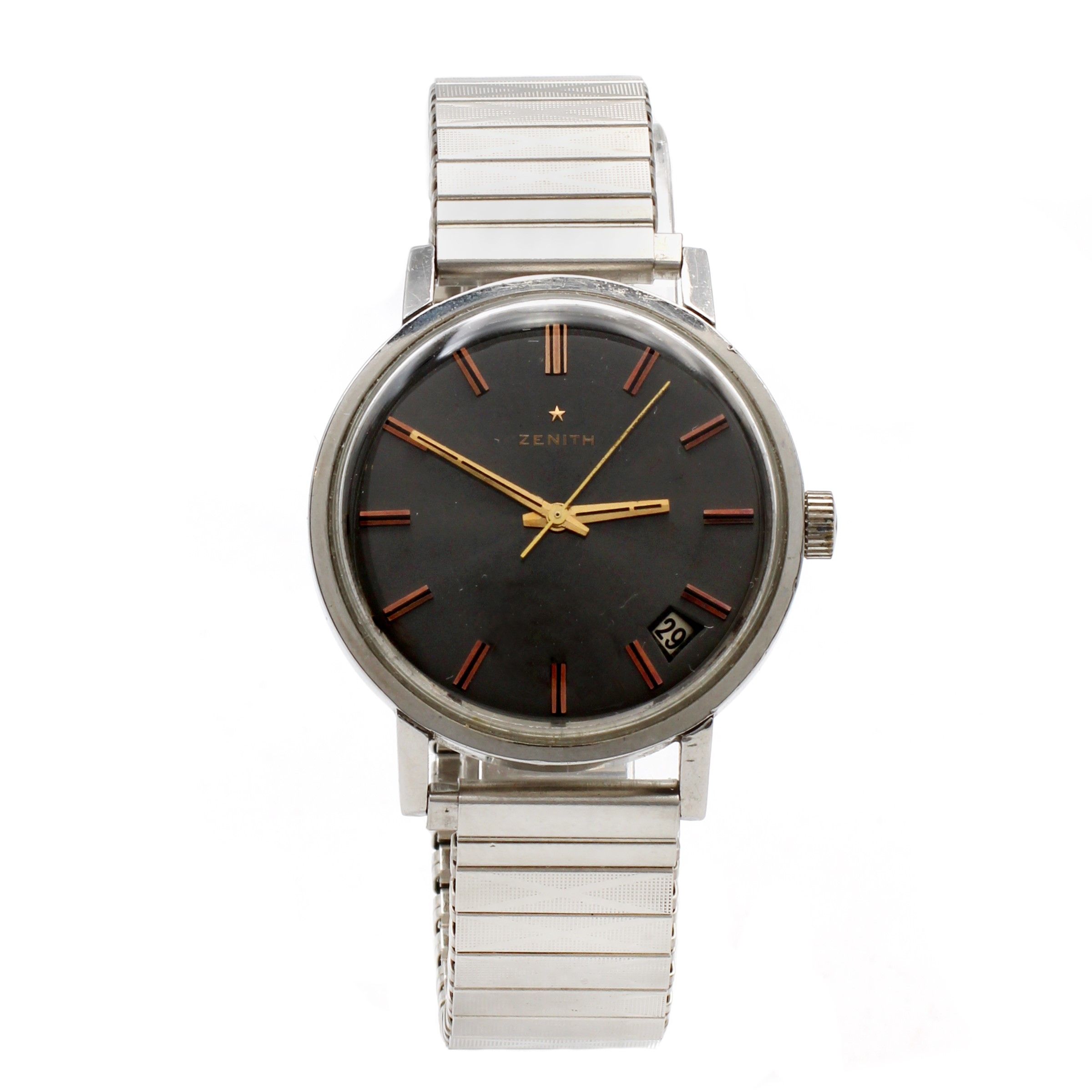 1960 circa in acciaio, oversize, cassa tonda 36 mm. quadrante grigio antracite con indici rosa, datario tra le ore 4 e 5, corona originale, movimento meccanico a carica manuale, bracciale vintage in metallo a molla estensibile