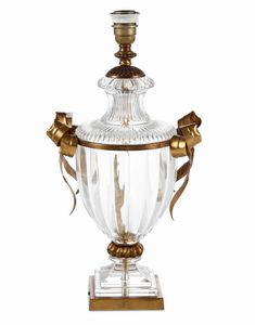 Lampada da tavolo in vetro molato con montatura in bronzo dorato. XX secolo