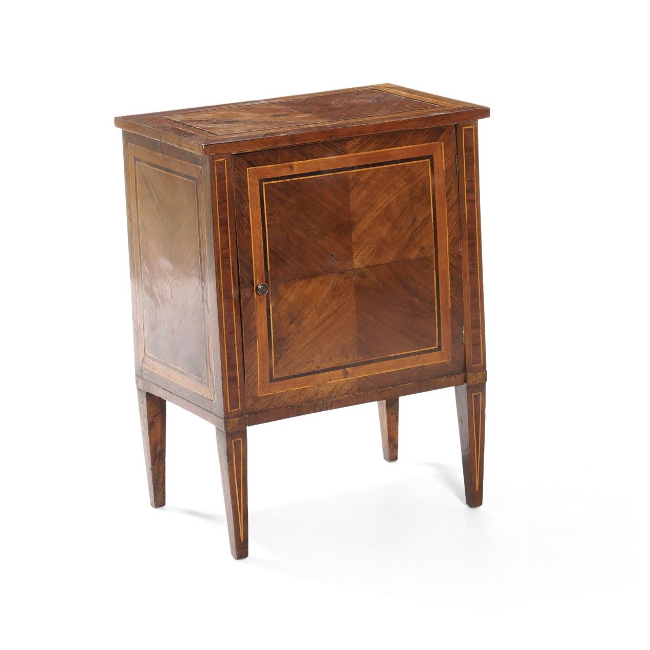 Comodino ad un'anta in legno lastronato. XIX secolo