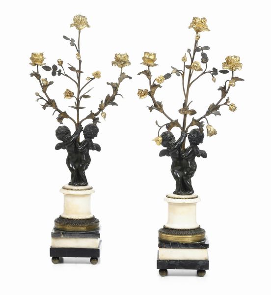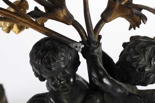 Coppia di candelabri con putti in bronzo brunito e dorato, Francia, XIX secolo