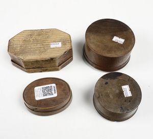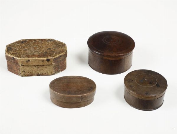 Quattro antiche scatoline in legno, tra cui una del XVIII secolo