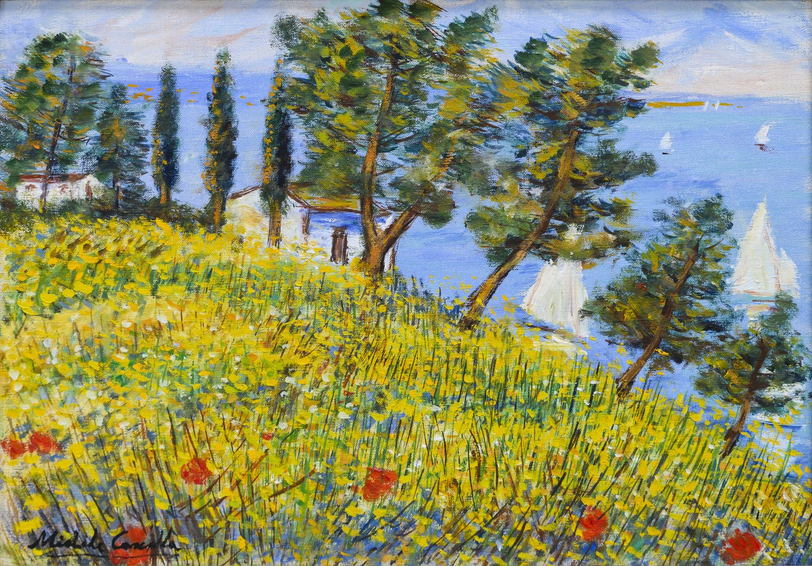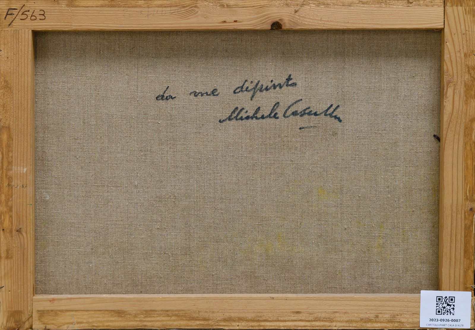 Firma in basso a sinistra e al retro. Autentica dell'artista su fotografia con timbro Galleria La Tavolozza, Riccione.