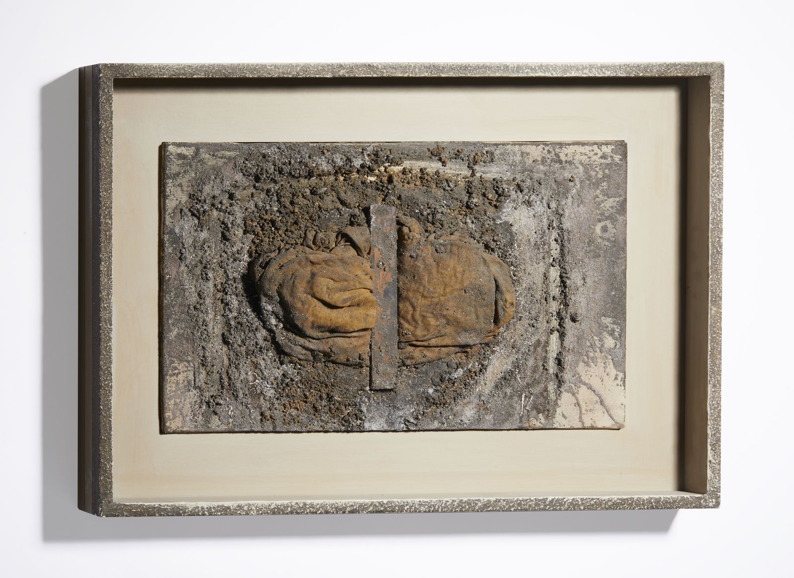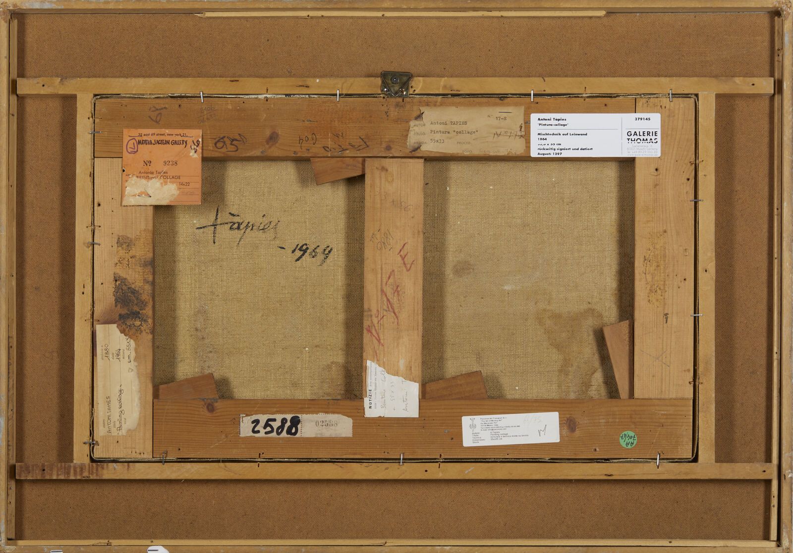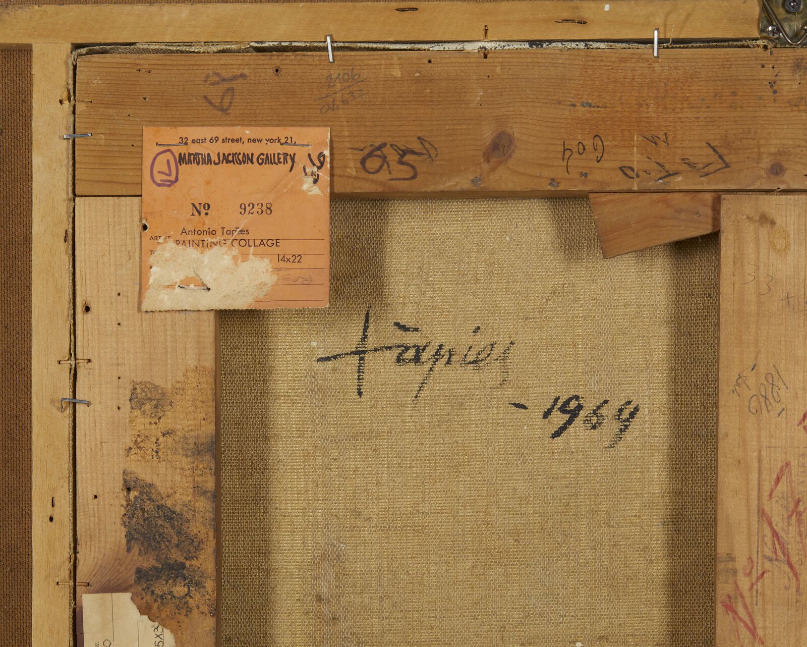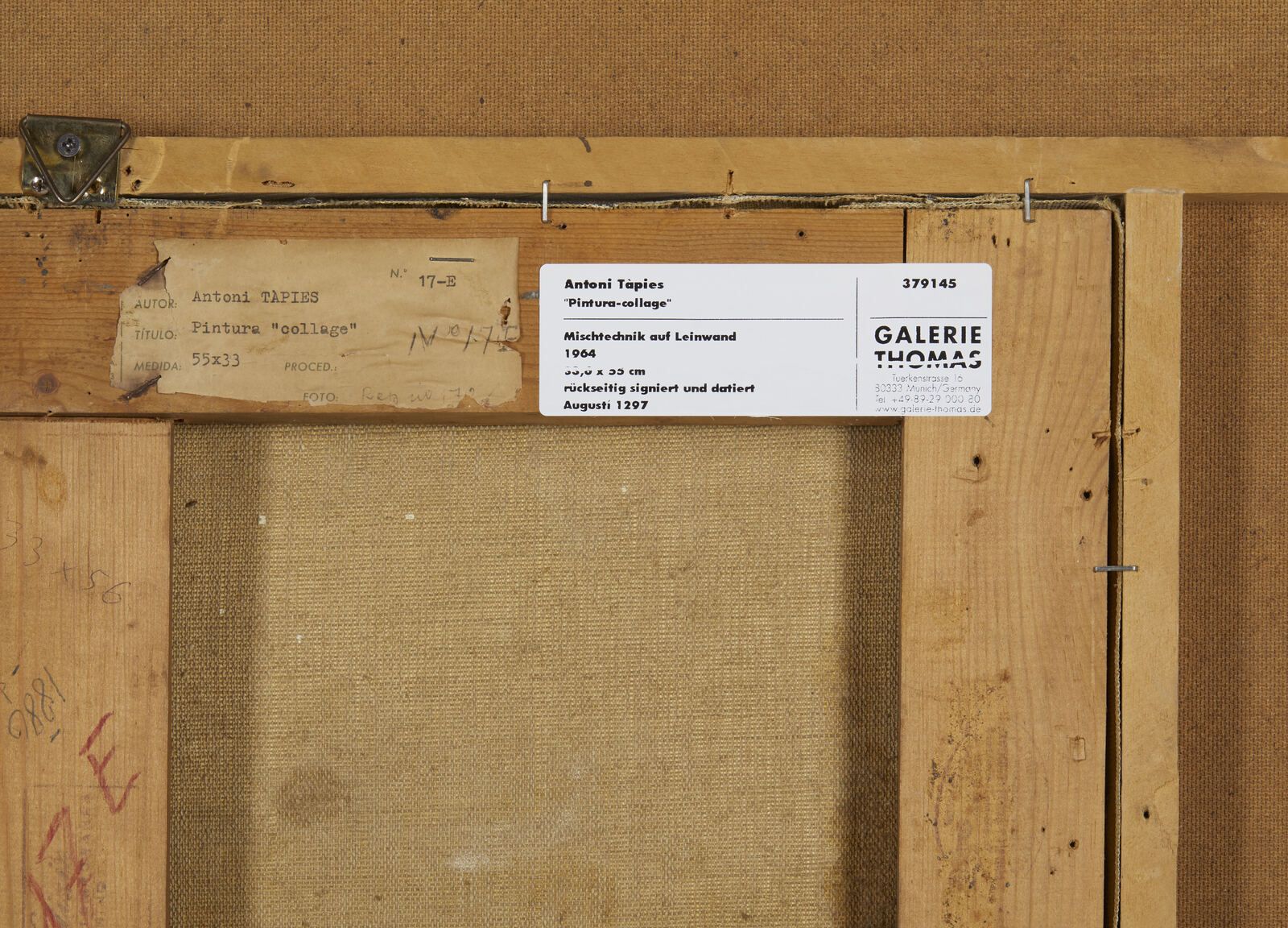 Al retro firma, anno, cartiglio descrittivo Galerie Thomas, Munich e cartiglio descrittivo Martha Jackson Gallery, New York. Pubblicazioni: J. Teixidor, Antoni Tapies. Fustes, papers, cartons, collages, Barcellona 1964, p. 172 (illustrato). P. Gimferrer, Tapies i l'esperit català, Barcellona 1974, p. 218, tav. 235 (illustrato). A. August́, Tapies. Catalogue Raisonnè, Barcellona 1990, vol. II, p. 209, n. 1297. Esposizioni: Roma, Galleria Il collezionista, Antoni Tapies, 1971, cat., p. 44-45, n. 17 h/e (illustrato). Provenienza: Sala Gaspar, Barcellona. Martha Jackson Gallery, New York. Galleria Toninelli, Roma. Galleria Il Collezionista, Roma. Collezione privata, Firenze.