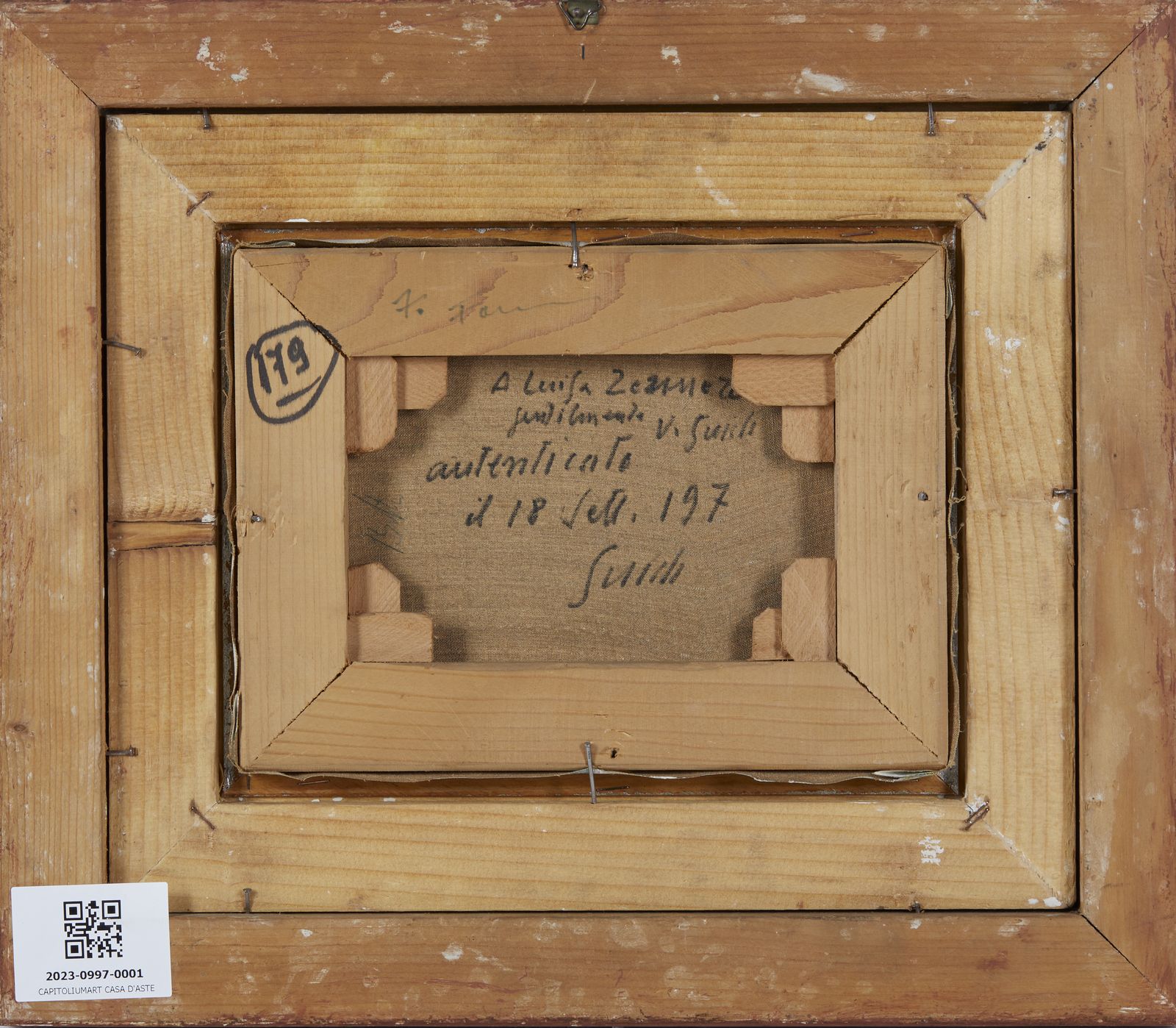 Firma in basso a destra. Al retro firma e dedica. Autentica dell'artista su fotografia con timbro Galleria d'Arte del Corso, Milano. Opera archiviata presso l'Archivio Storico Artisti Veneti, Mestre, come da documentazione fotografica allegata all'opera riportante il relativo numero d'inventario. 1970 circa.