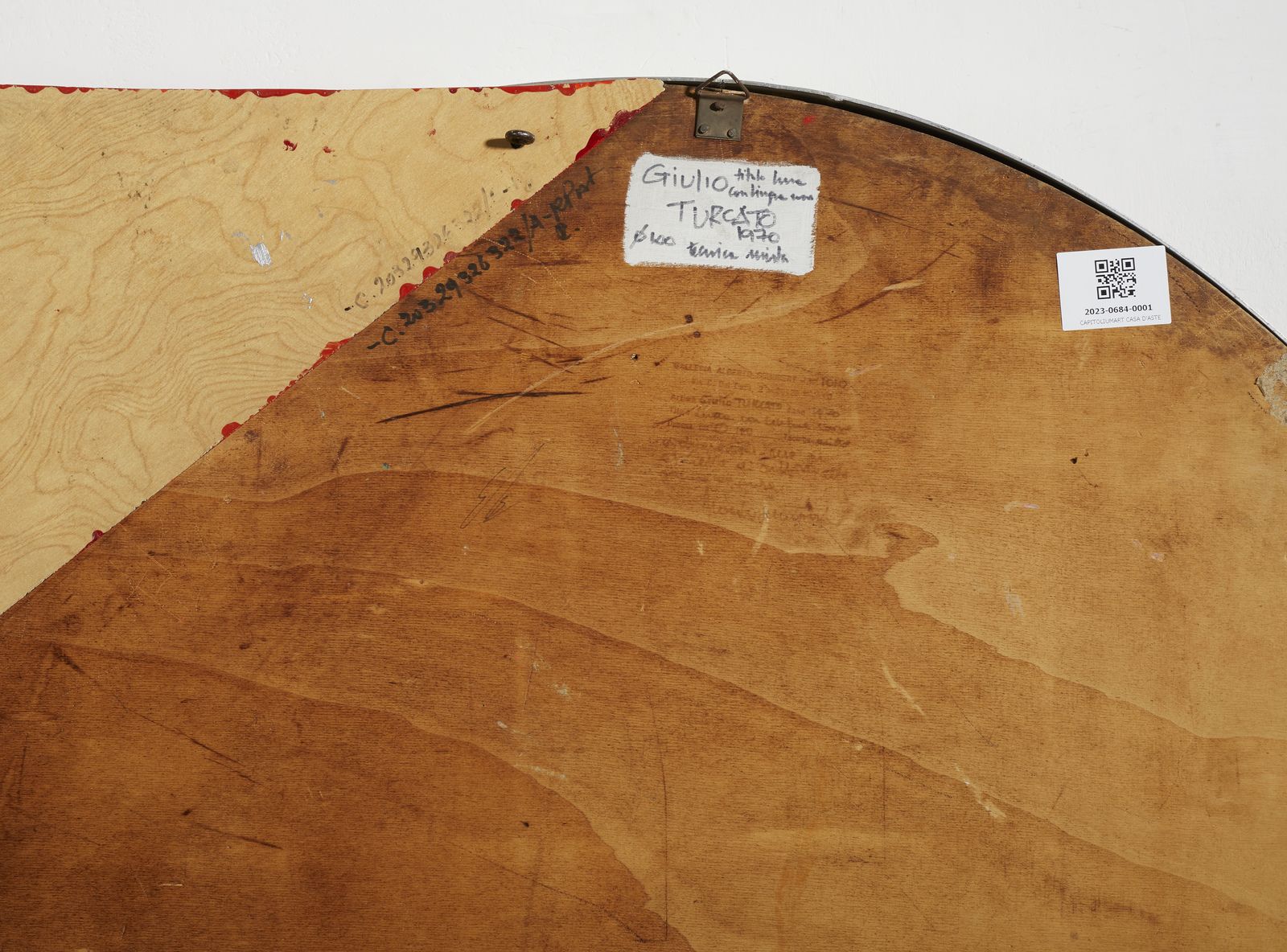 Al retro titolo, firma, anno e numero d'inventario. Autentica dell'artista su fotografia riportante il relativo numero d'inventario. Provenienza: Galleria Assumma, Roma. Collezione Sonnetti, Roma. Collezione privata, Roma. Si ringrazia l'Archivio Turcato per aver confermato la presenza dell'opera nei loro archivi. Difetti.