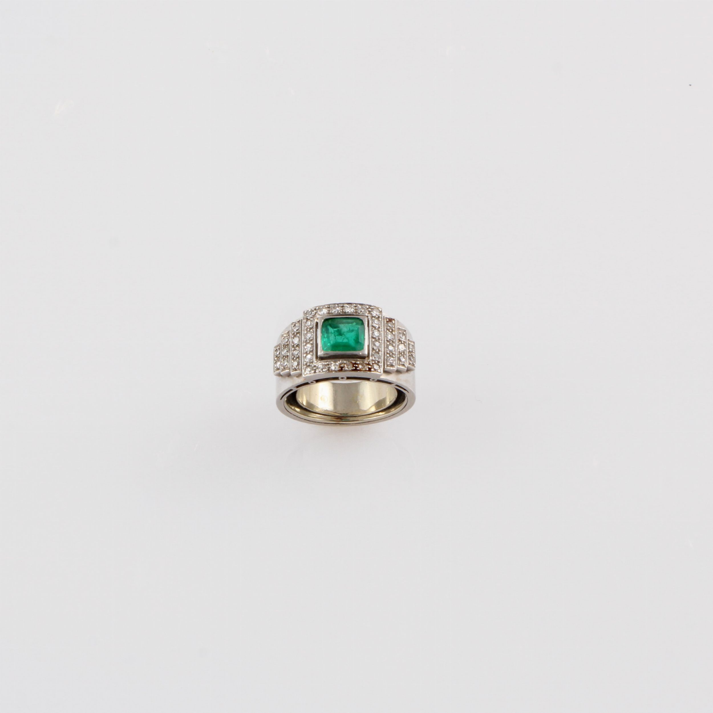 in platino a fascia gradinata con diamanti e smeraldo al centro, gr. 13,7.