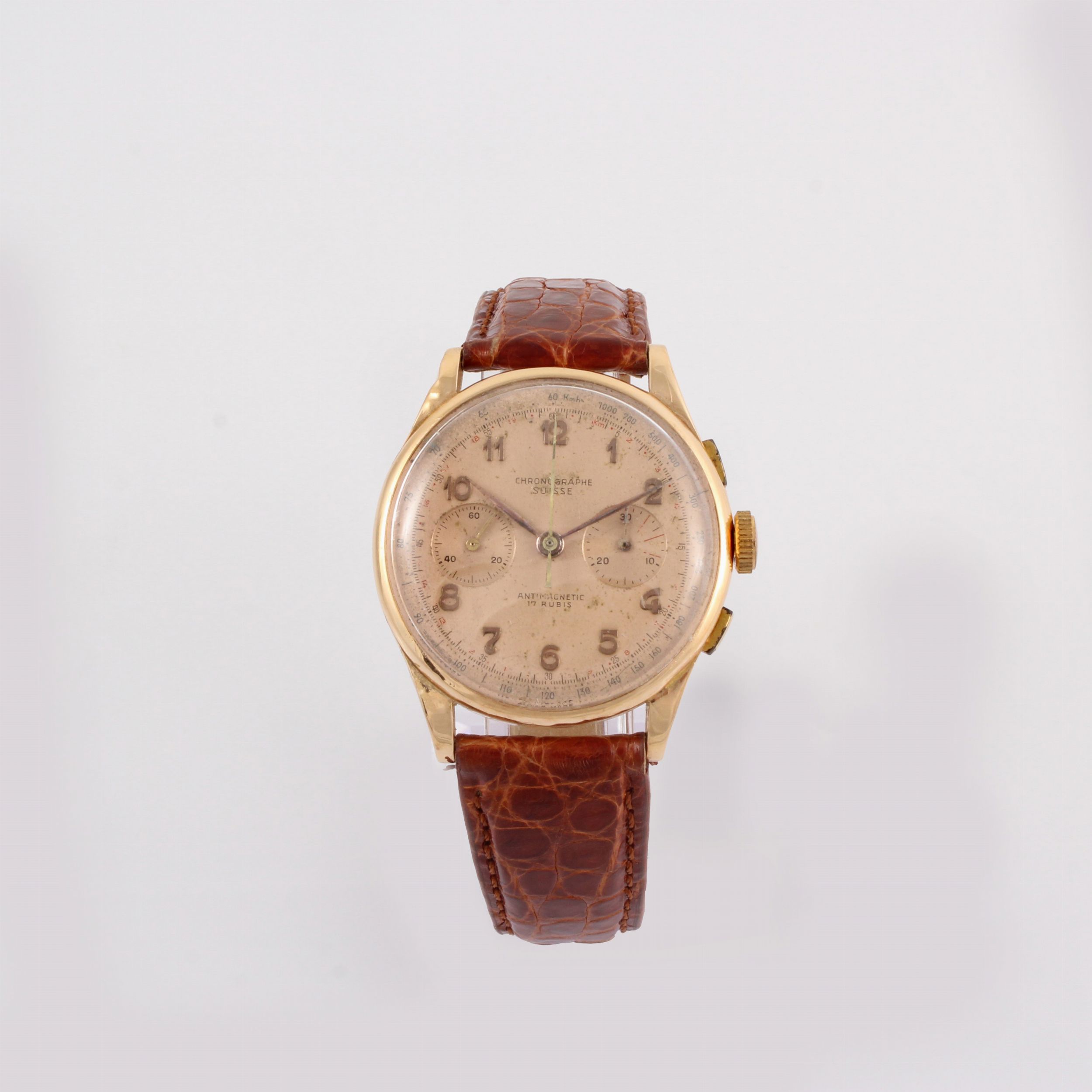 Quadrante: salmone, numeri Arabi, contatore dei secondi e 30 minuti. Sfere a foglia