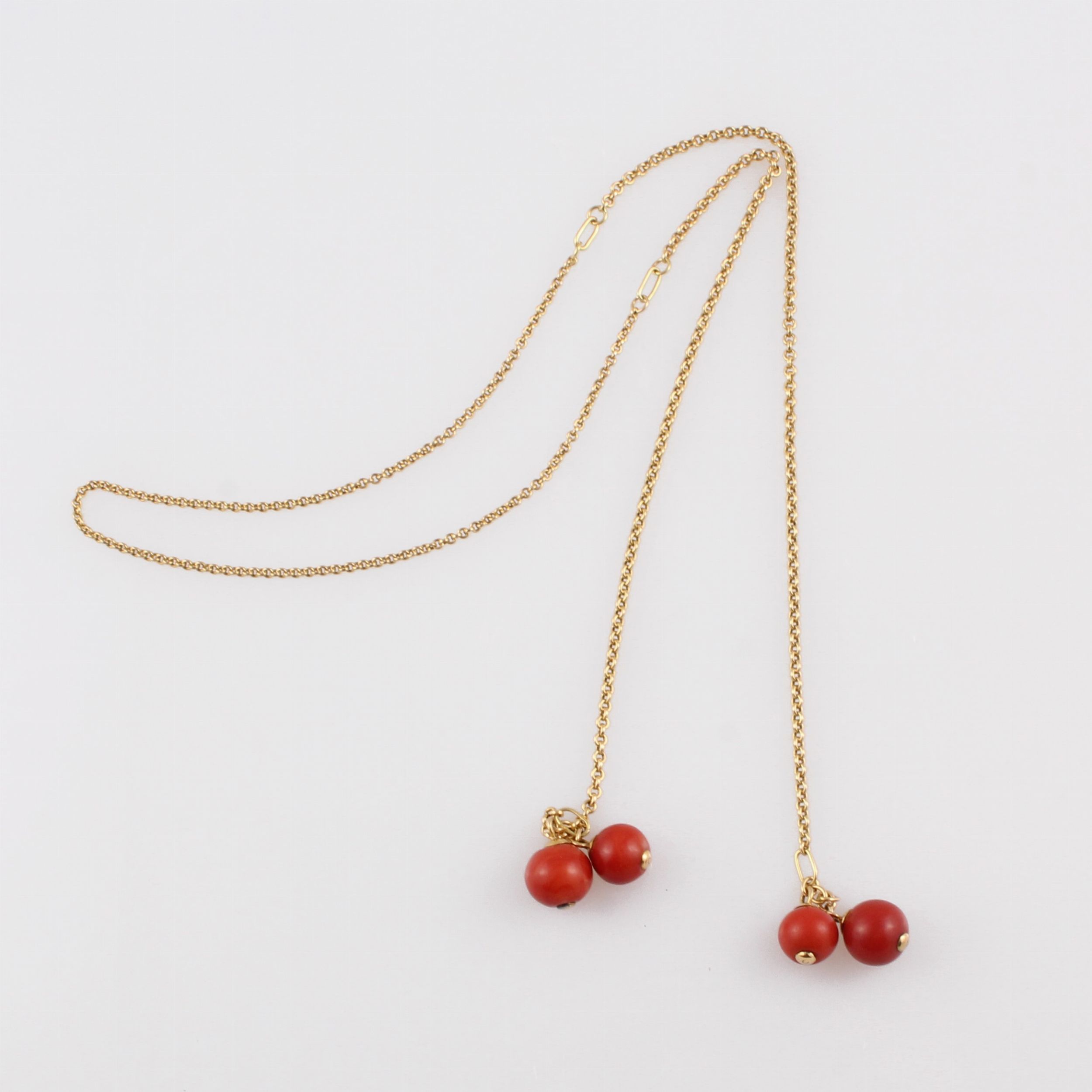 a sciarpa in oro giallo priva di chiusura con sfere di corallo terminali, gr. 24,9.