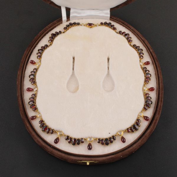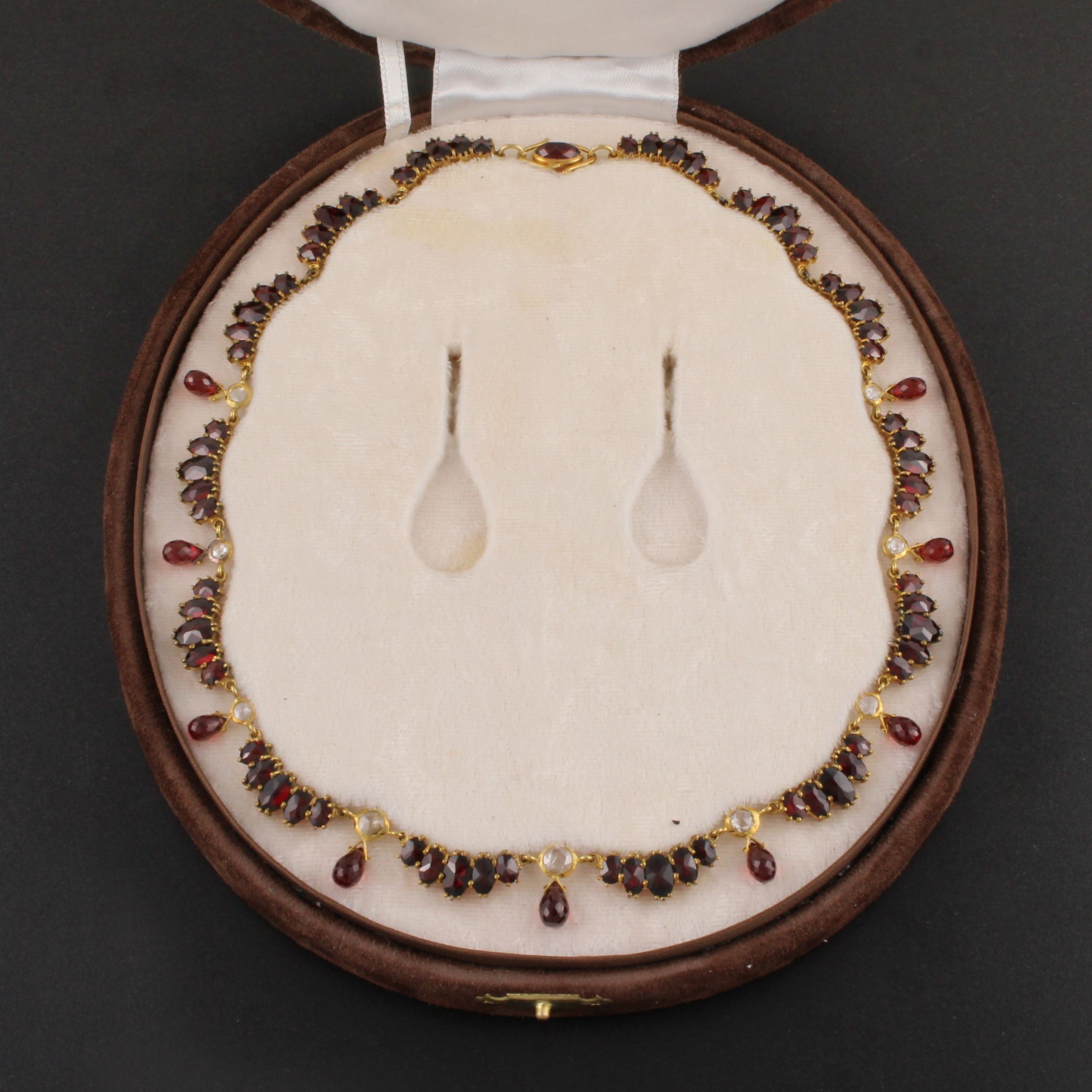 in oro giallo con granati e diamanti taglio a rosa, chiusura a doppio gancio, gr. 31,6. Corredata da custodia.