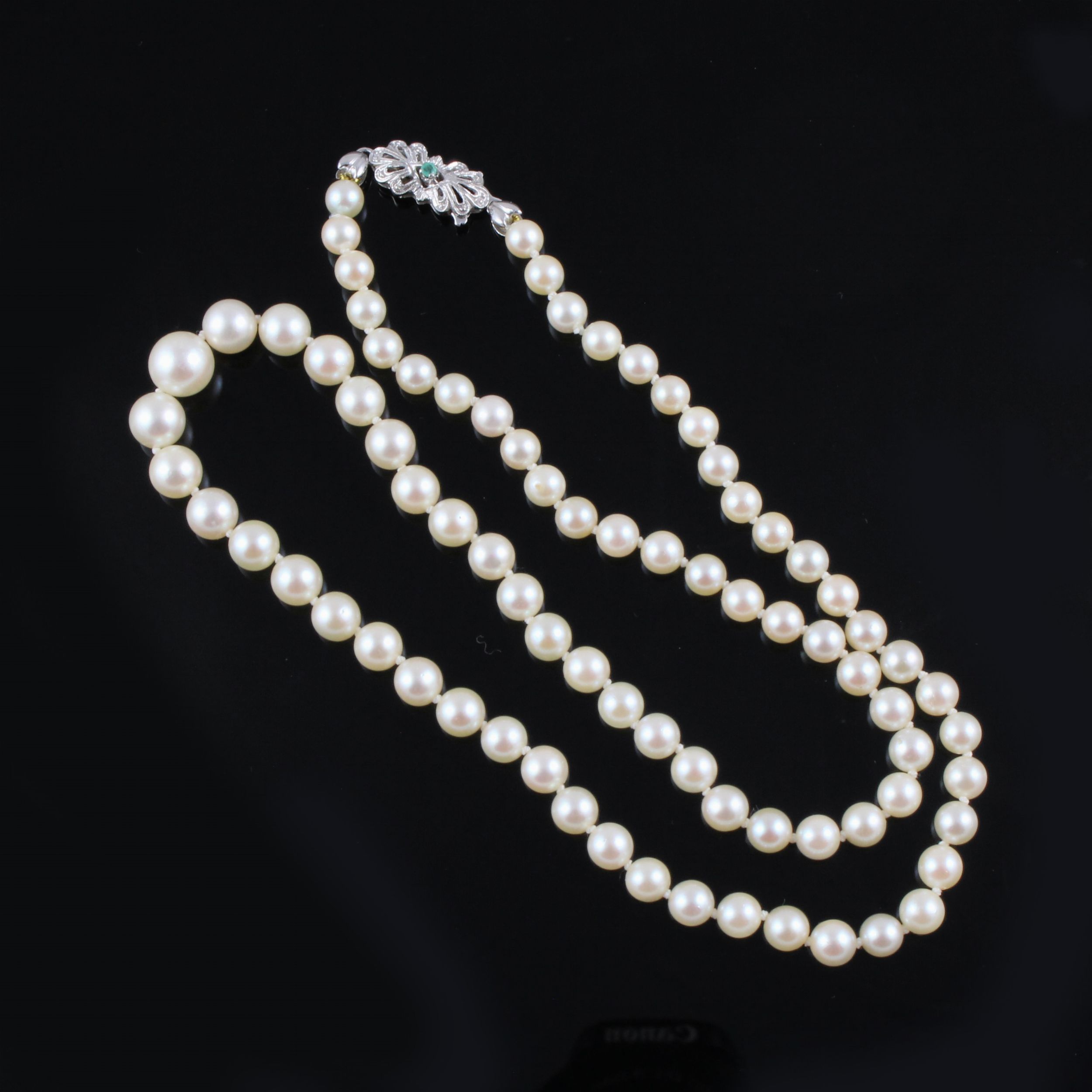 ad un filo di perle poste in gradazione 8,5 / 5 mm con chiusura in oro bianco e piccolo smeraldo, gr. 24,2.