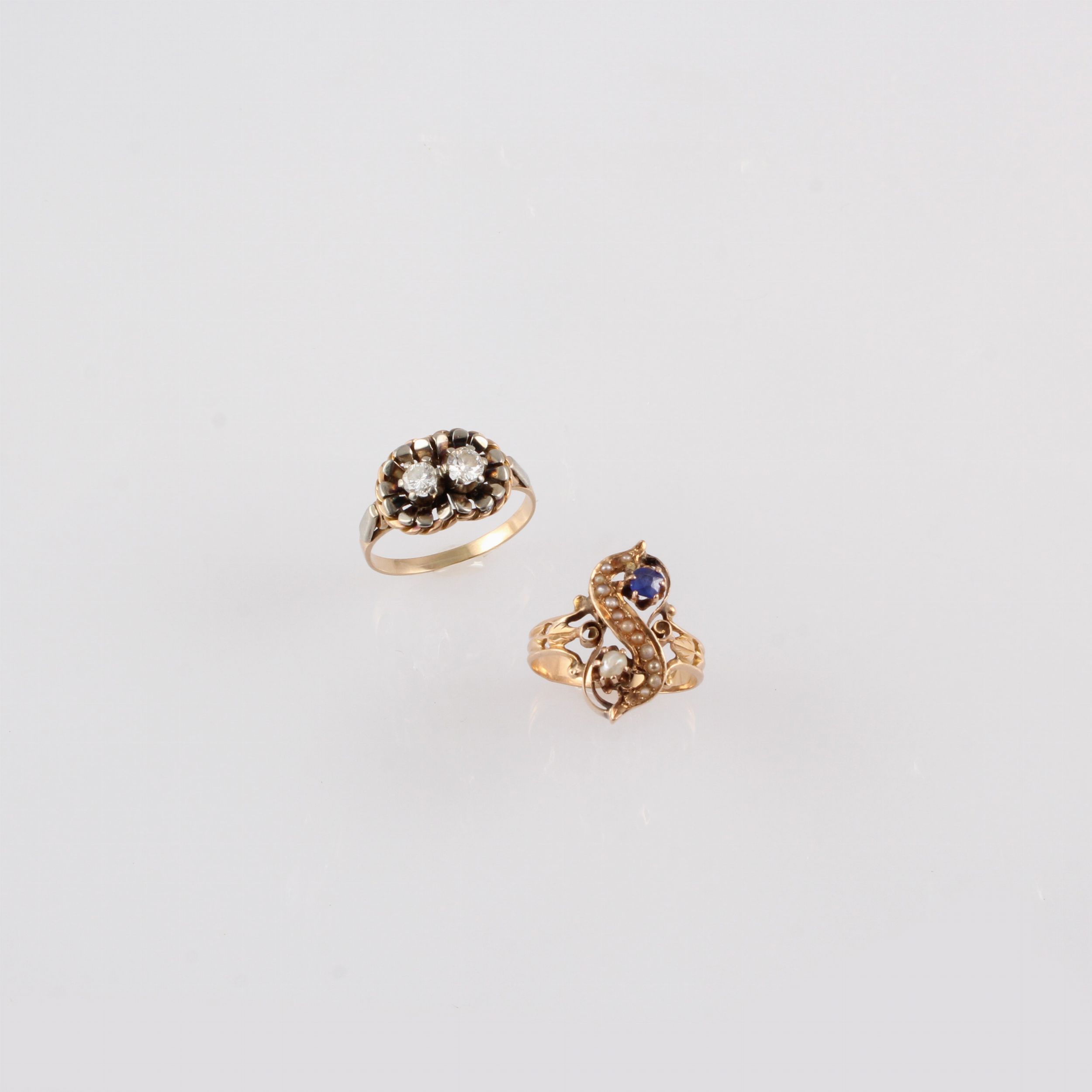 in oro con brillanti, perline e pietra sintetica blu, gr. complessivi 7,4.