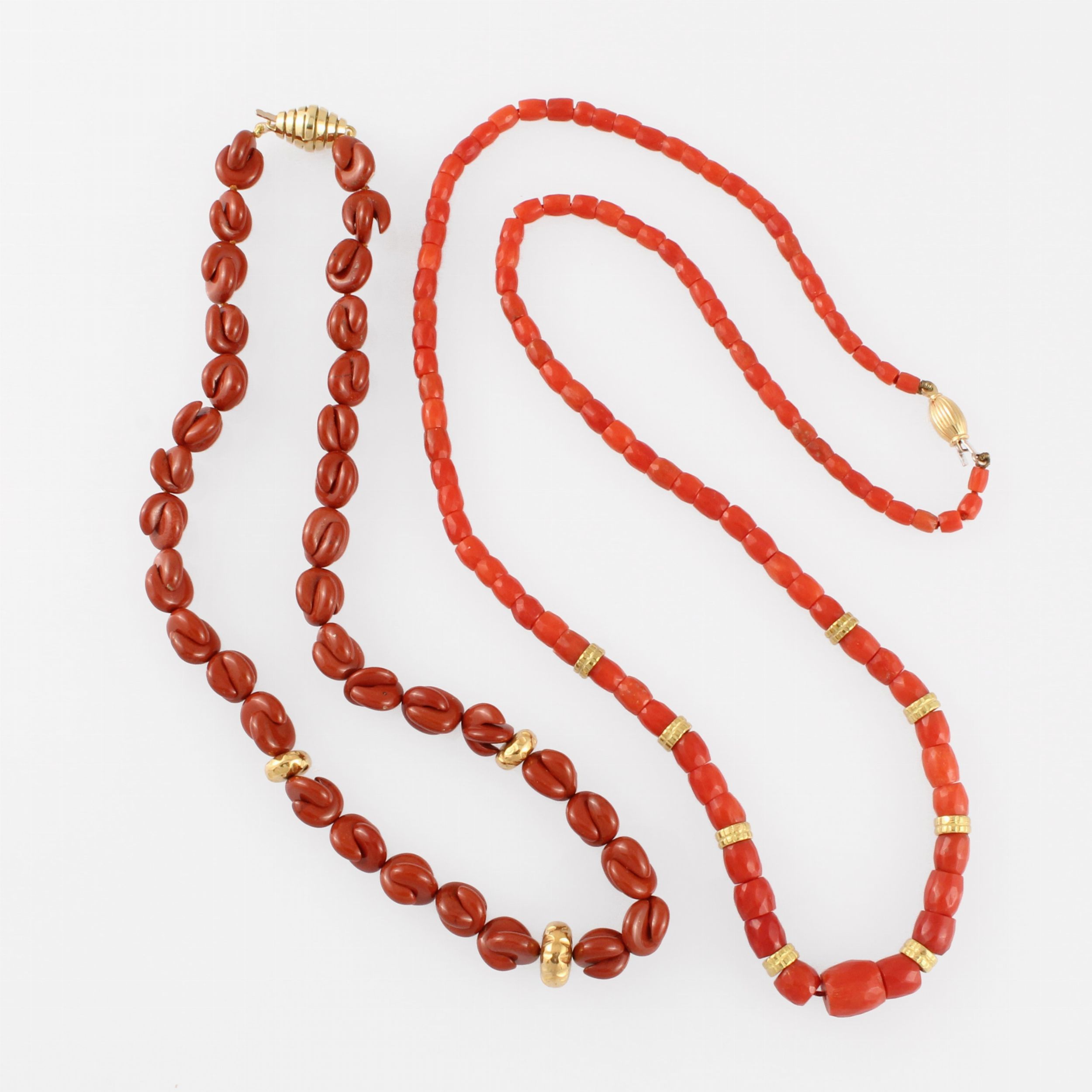 ad un filo di coralli a barilotto sfeccattati a scalare con rondelle in oro e un filo con elementi sagomati in diaspro e tre rondelle in oro; chiusure in oro giallo, gr. complessivi 75,3.