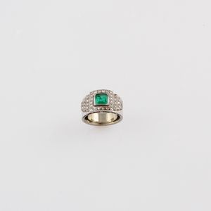 in platino a fascia gradinata con diamanti e smeraldo al centro, gr. 13,7. Misura 7 / 11 (regolabile)