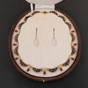 in oro giallo con granati e diamanti taglio a rosa, chiusura a doppio gancio, gr. 31,6. Corredata da custodia. [..]