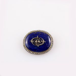 portaritratto ovale in argento e oro con lapislazzuli e pietre sintetiche. Misure 4,7 x 3,8 cm ca.