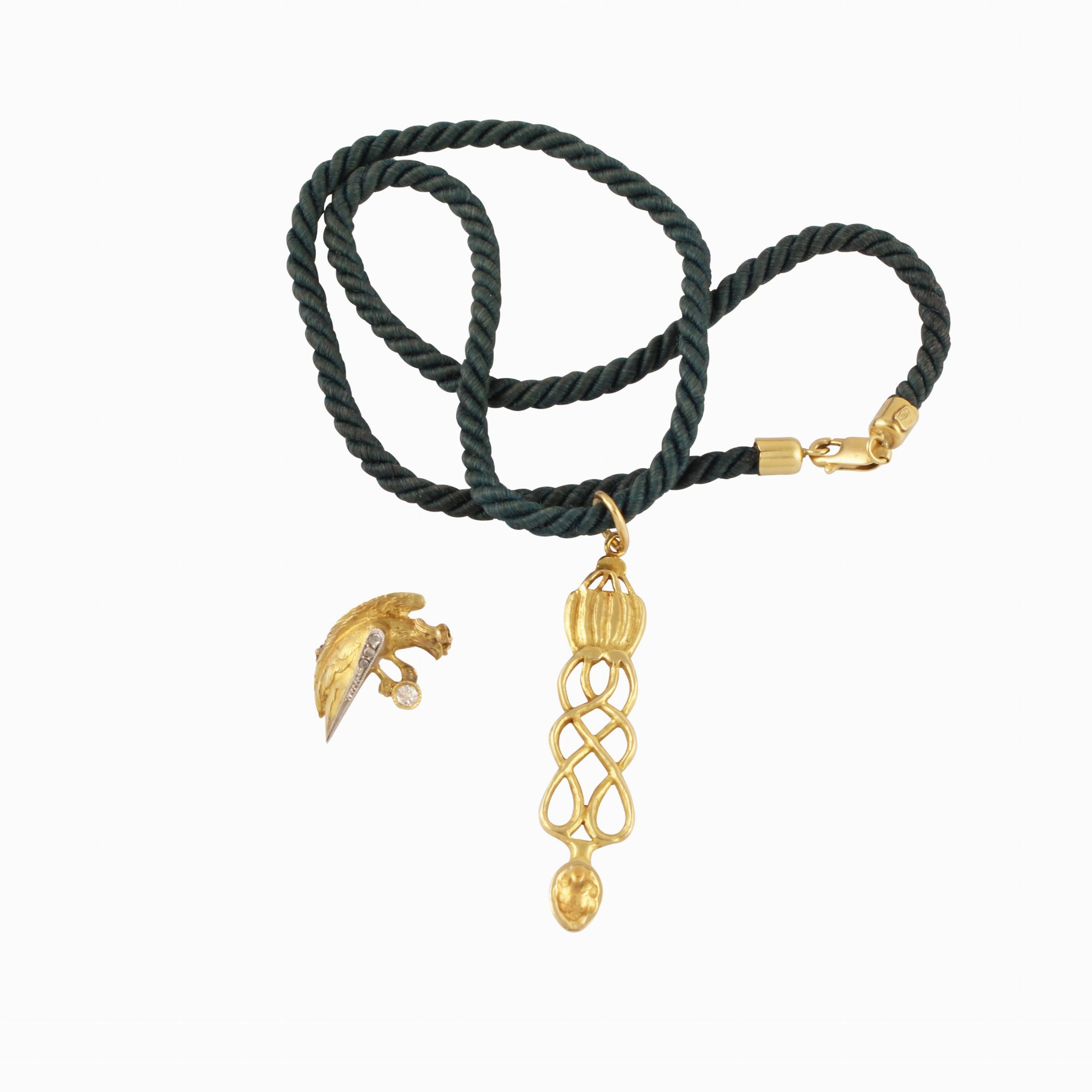 in oro composto da pendente traforato con girocollo a cordoncino con chiusura a moschettone e spilla raffigurante un'aquila con piccoli diamanti, gr. complessivi 7,8 ca. (escluso cordoncino).