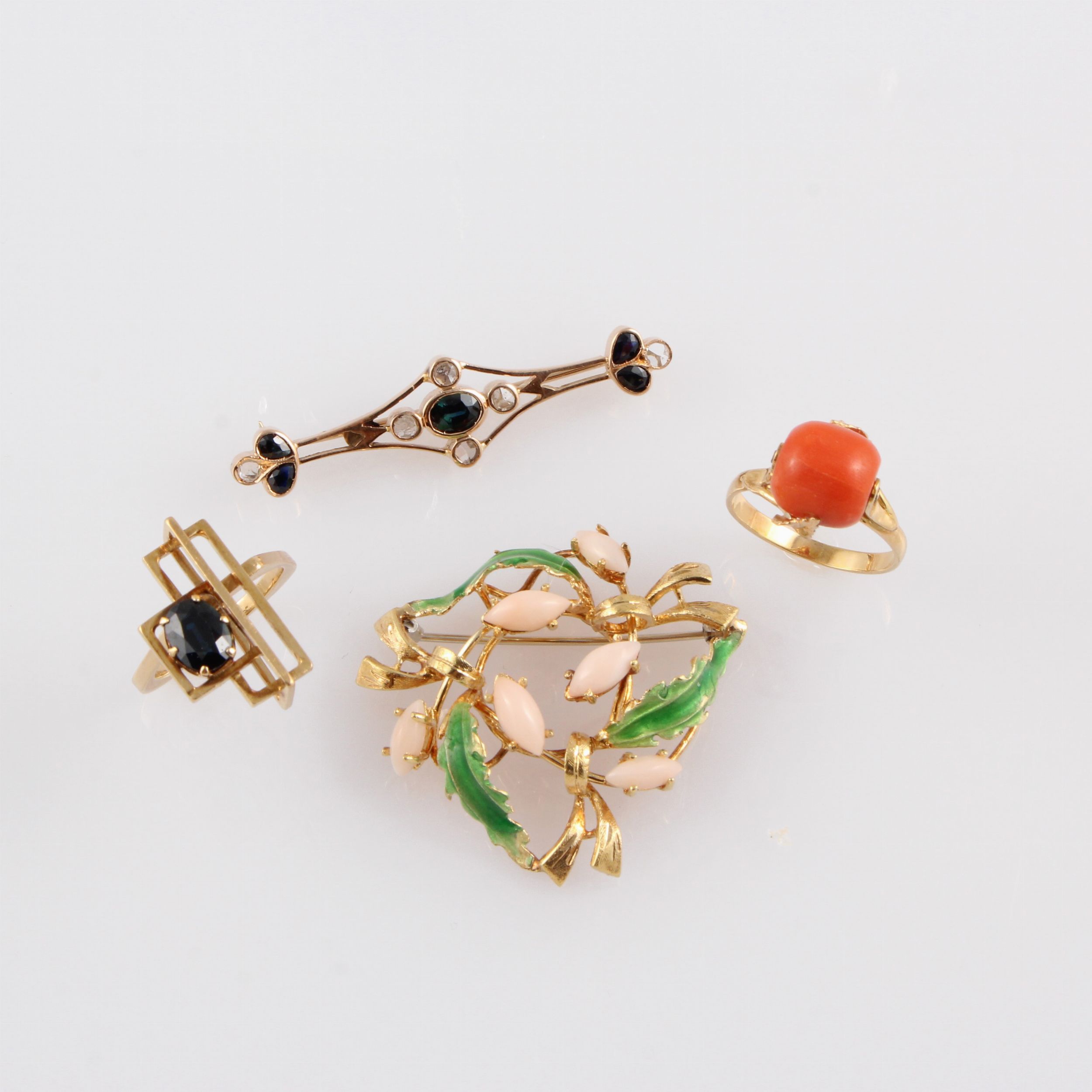 costituito da due spille e due anelli in oro con coralli, zaffiri, diamanti taglio a rosa e smalto, gr. complessivi 26,4.