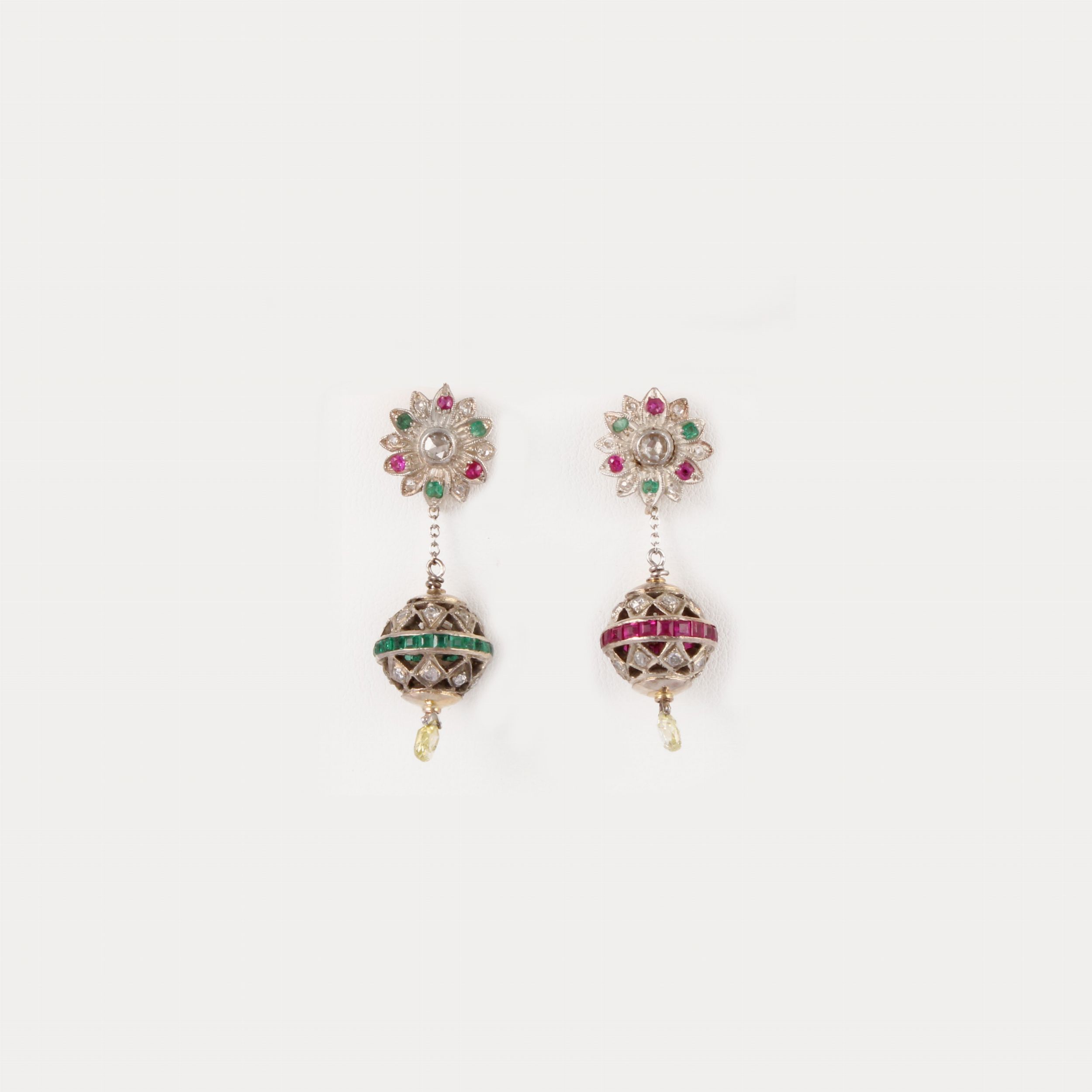 pendenti in argento ciascuno con motivo floreale e sfera traforata, ornati da diamanti taglio a rosa, smeraldi, rubini e diamante briolette sospeso, gr. 13,7 (fermi in oro).