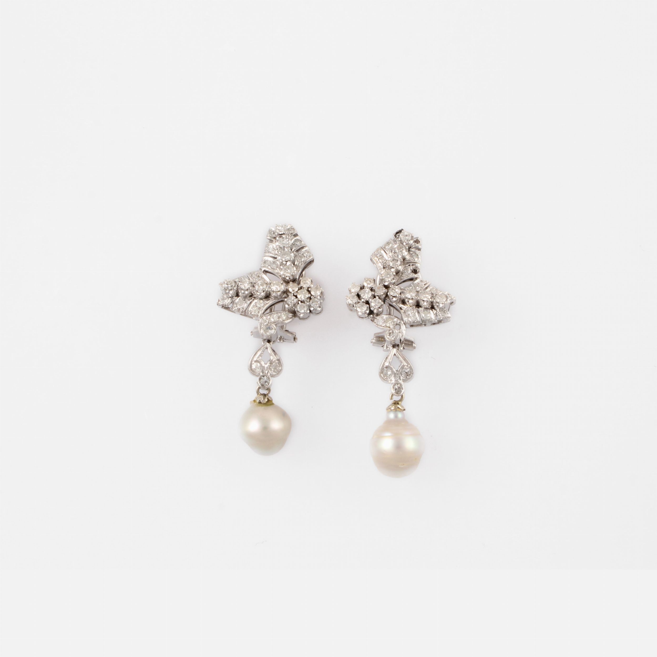 pendenti in oro bianco a motivo floreale traforato con diamanti (due mancanti) e perla sospesa, gr. 15,7.