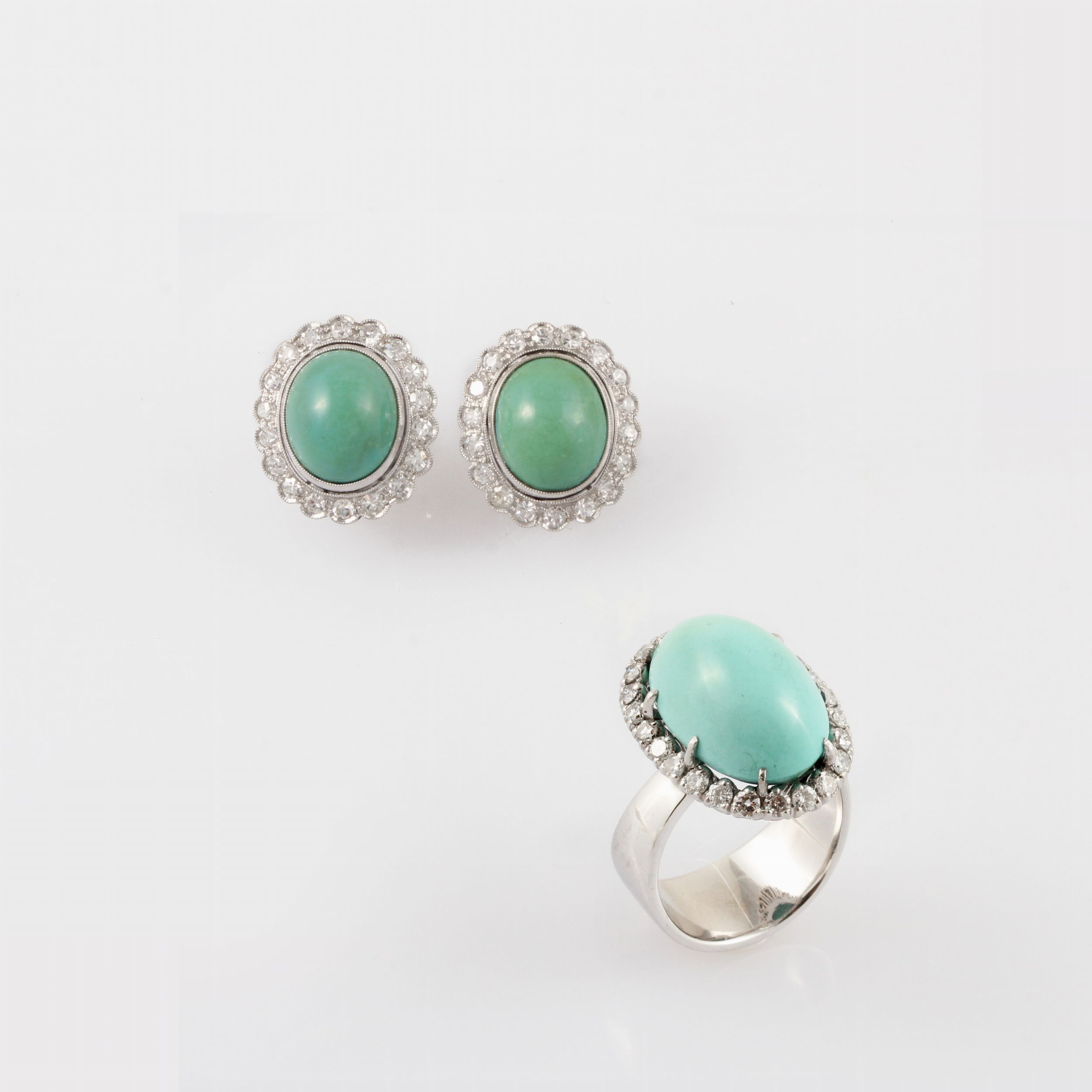 in oro bianco con turchese centrale contornata da diamanti, gr. complessivi 23,4.