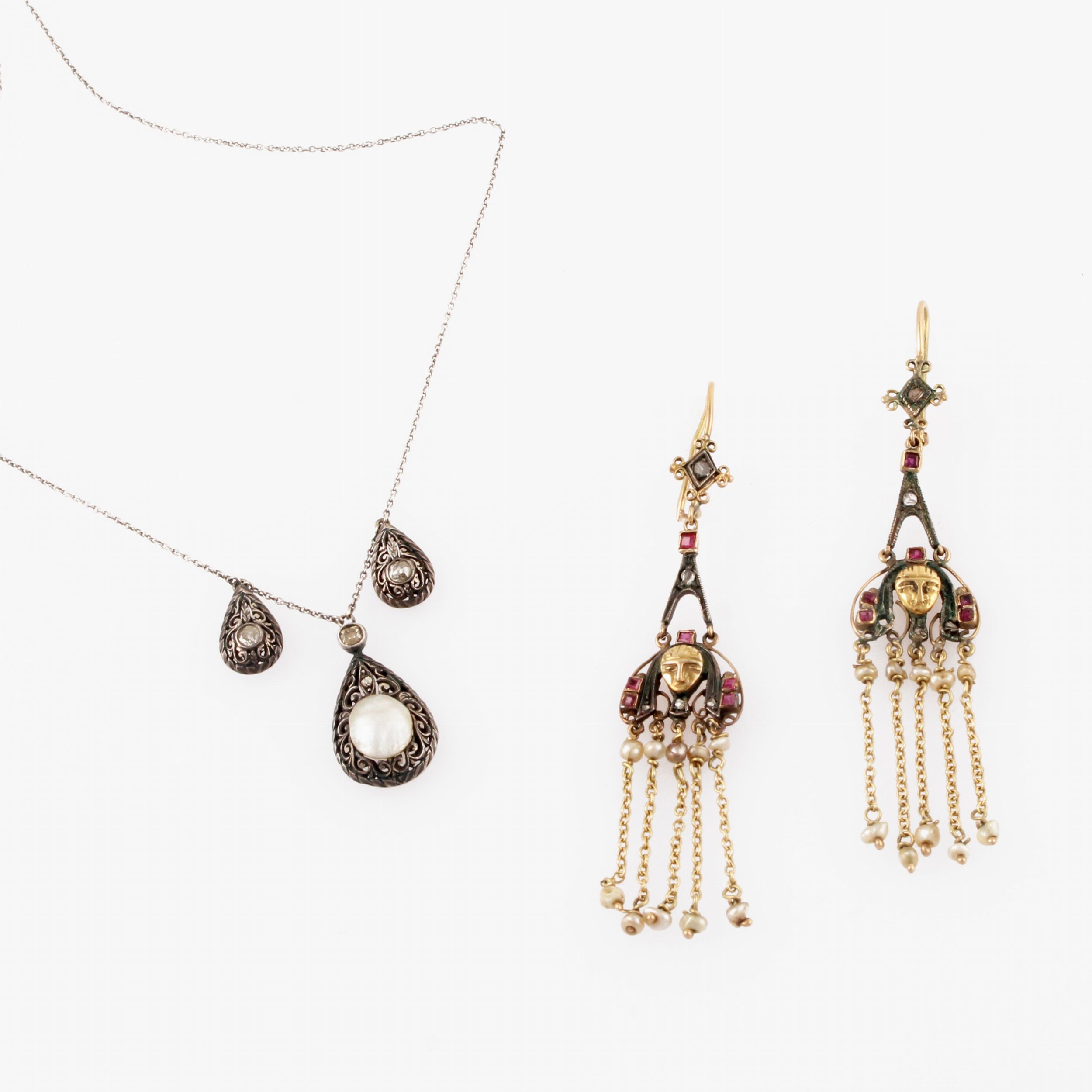 pendenti con rubini perline e diamanti a rosa (uno mancante) e una catenina con al centro tre pendenti a goccia traforati con madreperla e diamanti a rosa, realizzati in argento e oro, gr. complessivi 12,1.