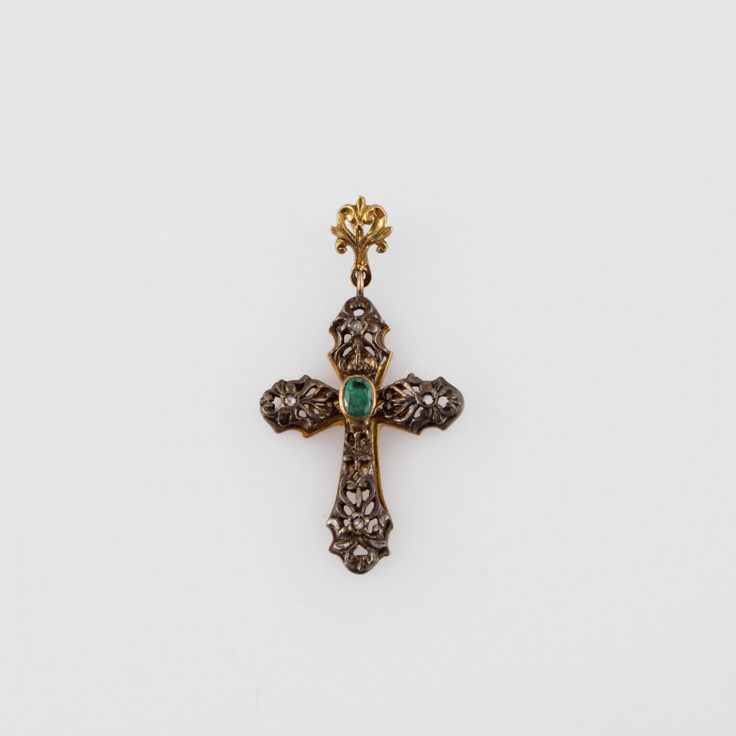 in oro e argento a croce traforata con smeraldo centrale e diamanti taglio a rosa, gr. 6,6.
