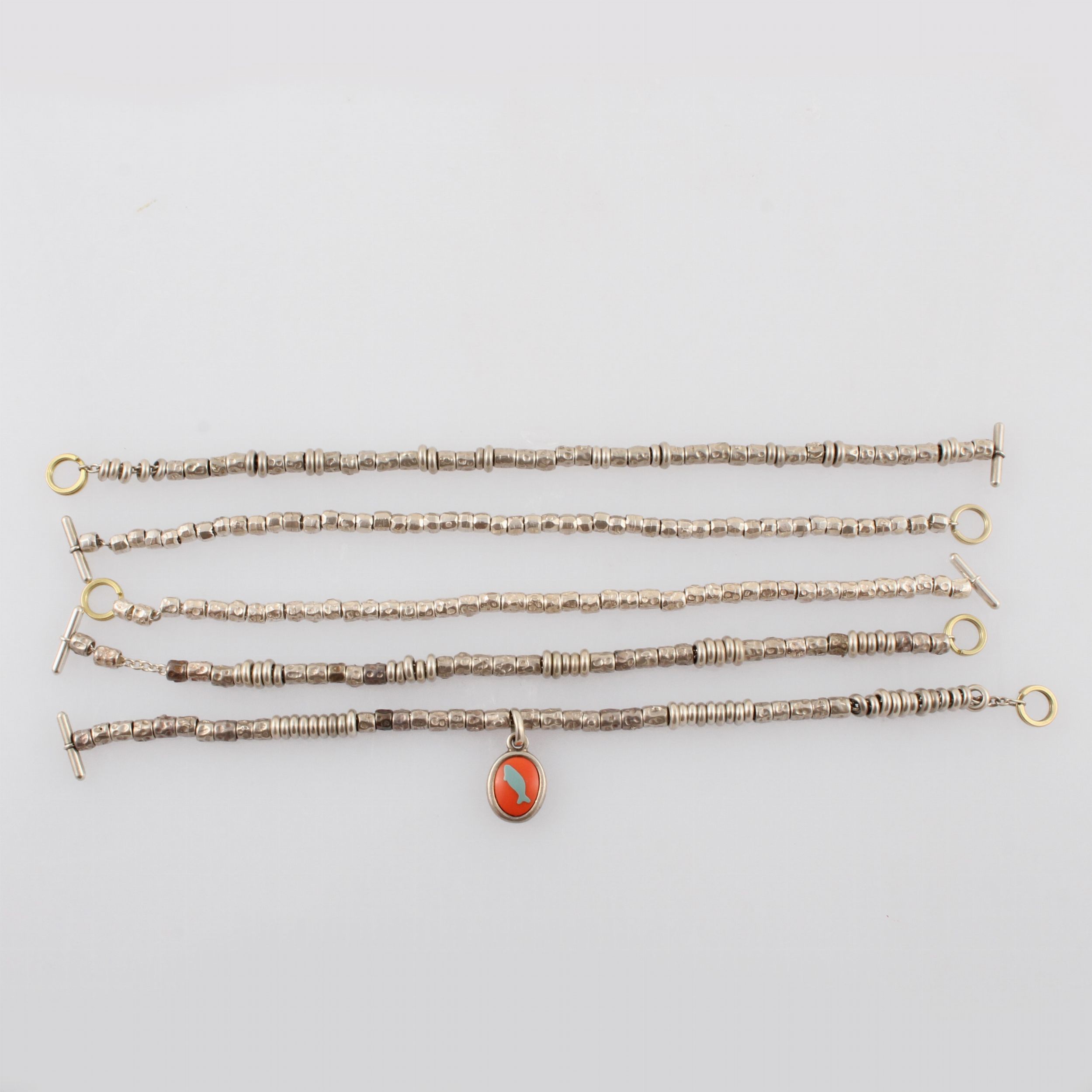 con granelli e rondelle in argento 925 di cui uno con pendente in smalto raffigurante un pesce e recante al verso la scritta un pesce fuor d'acqua, gr. complessivi 66,5.