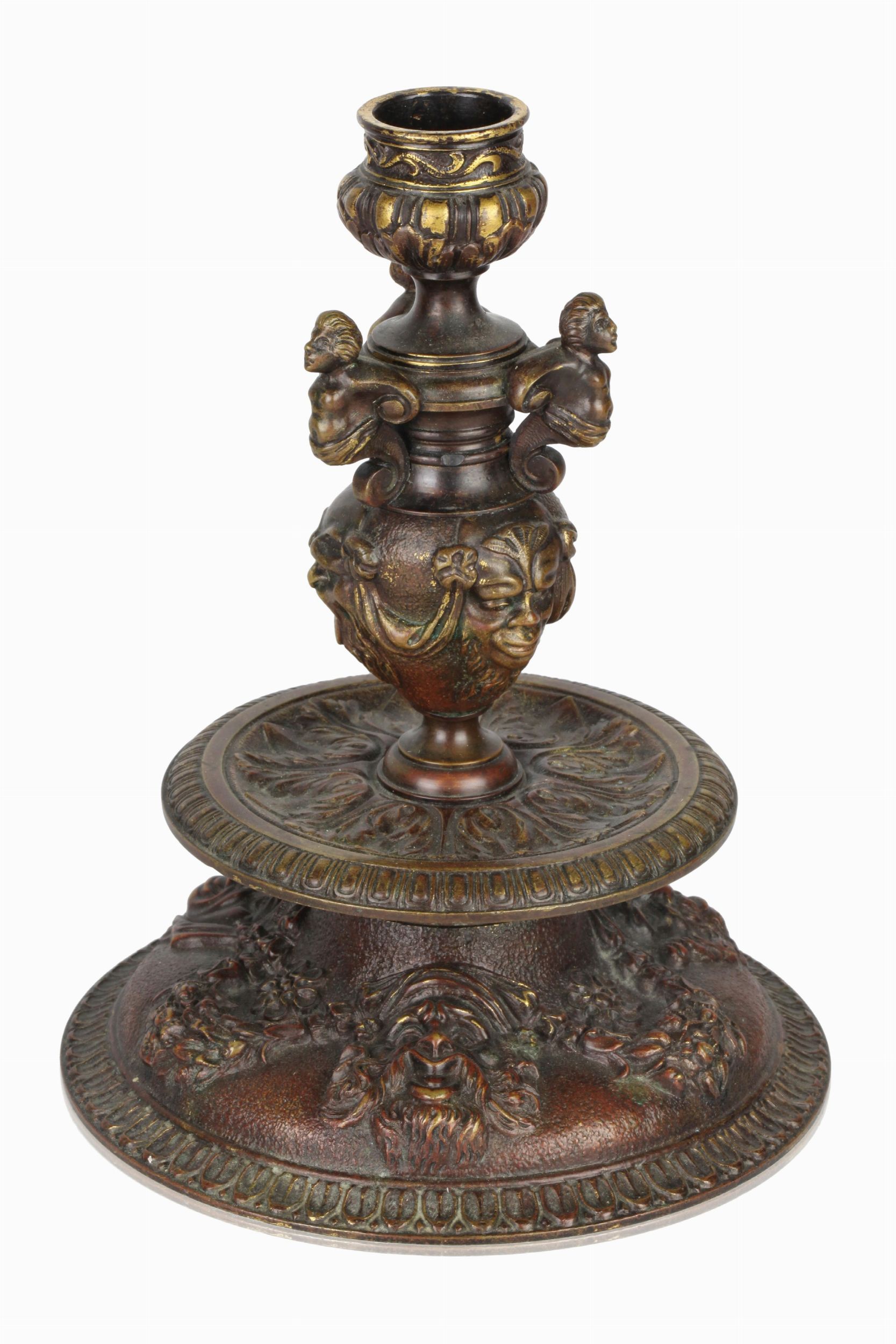 Bel candeliere istoriato a base circolare. Nella prima fascia decorativa tre mascheroni grotteschi diversi l'uno dall'altro uniti da festoni su un fondo a buccia d'arancia.