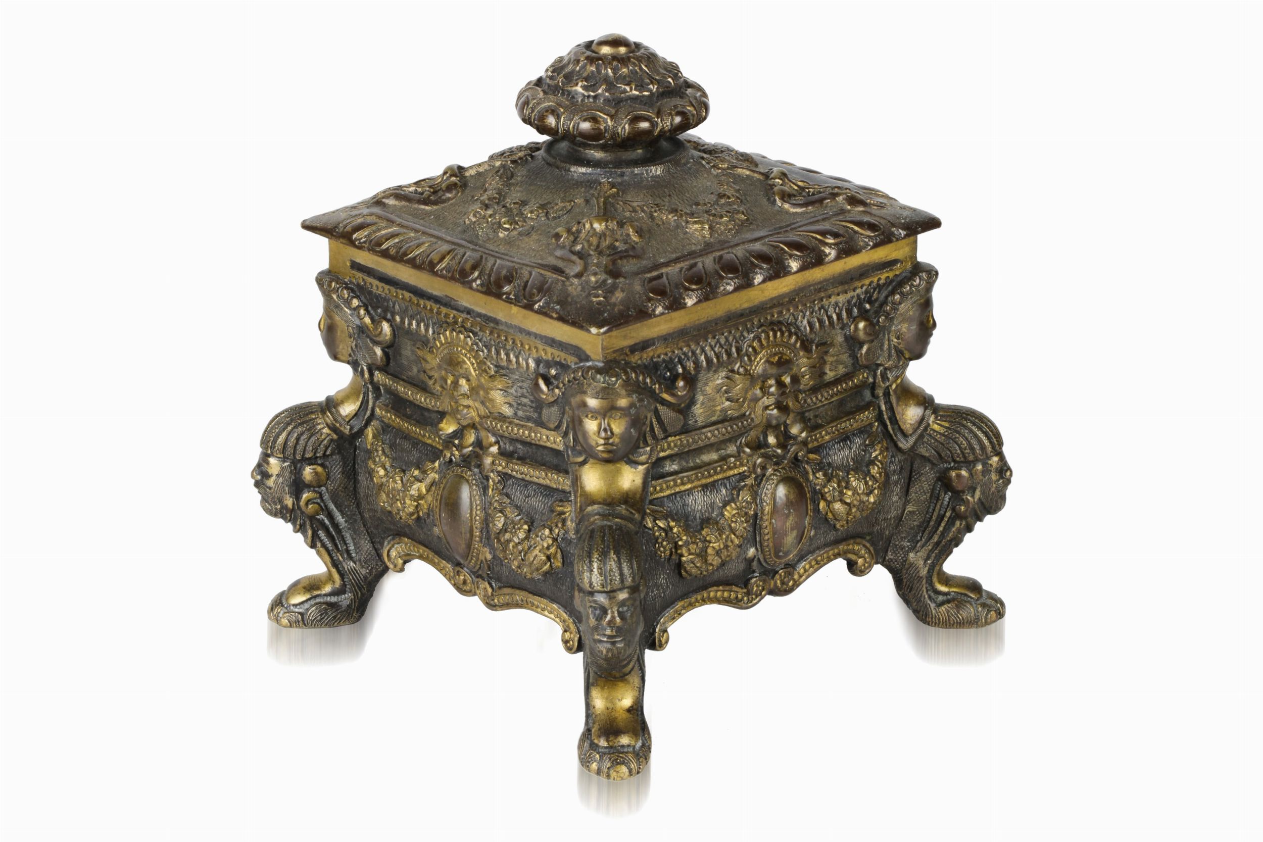 Bel cofanetto in bronzo con tracce di doratura esterna. Nei tipici modi della bronzistica rinascimentale padovana con il suo patrimonio iconografico popolato di mascheroni grotteschi e ghirlande.
