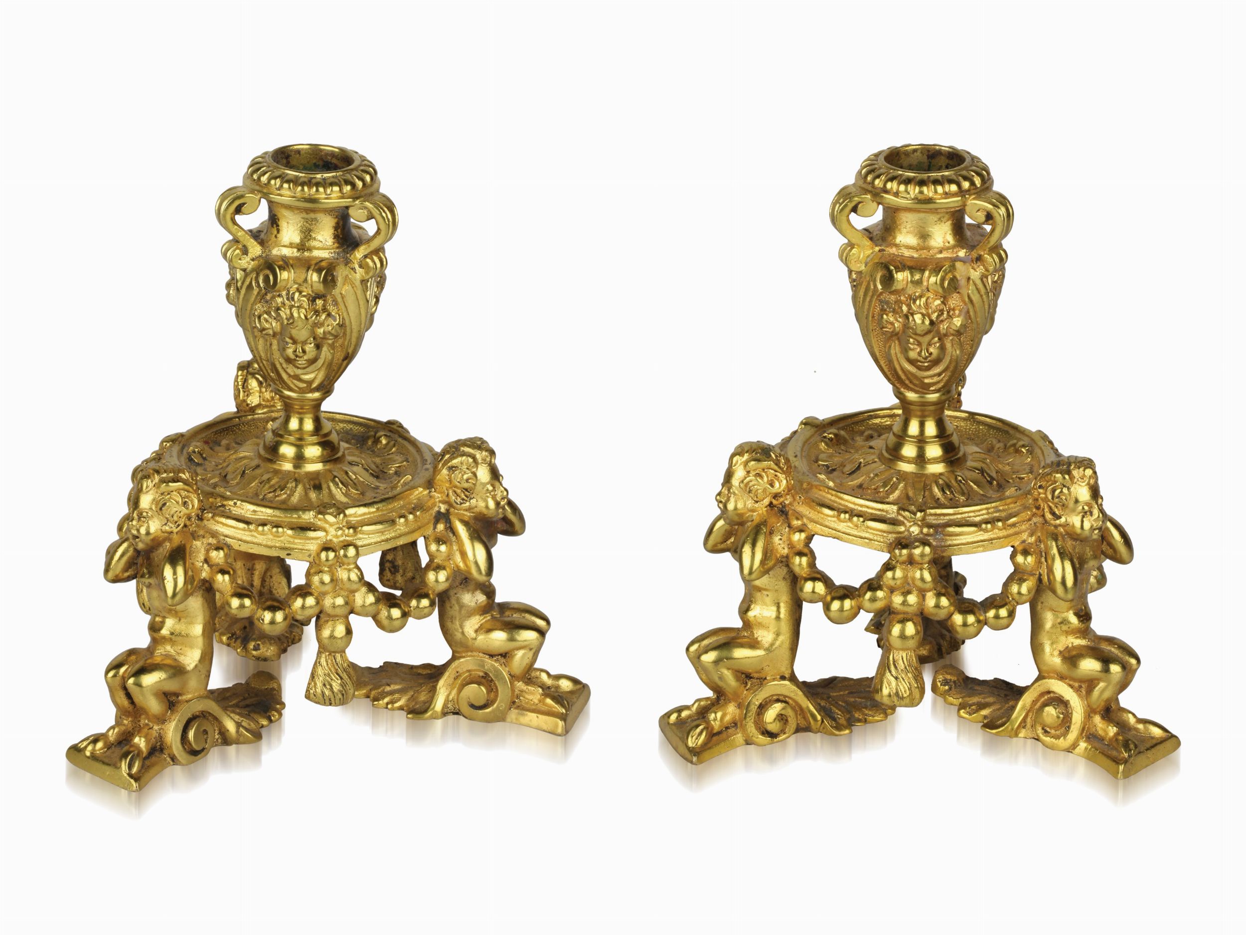 Bella coppia di candelieri del XVII secolo in bronzo dorato con base sorretta da tre satiretti.