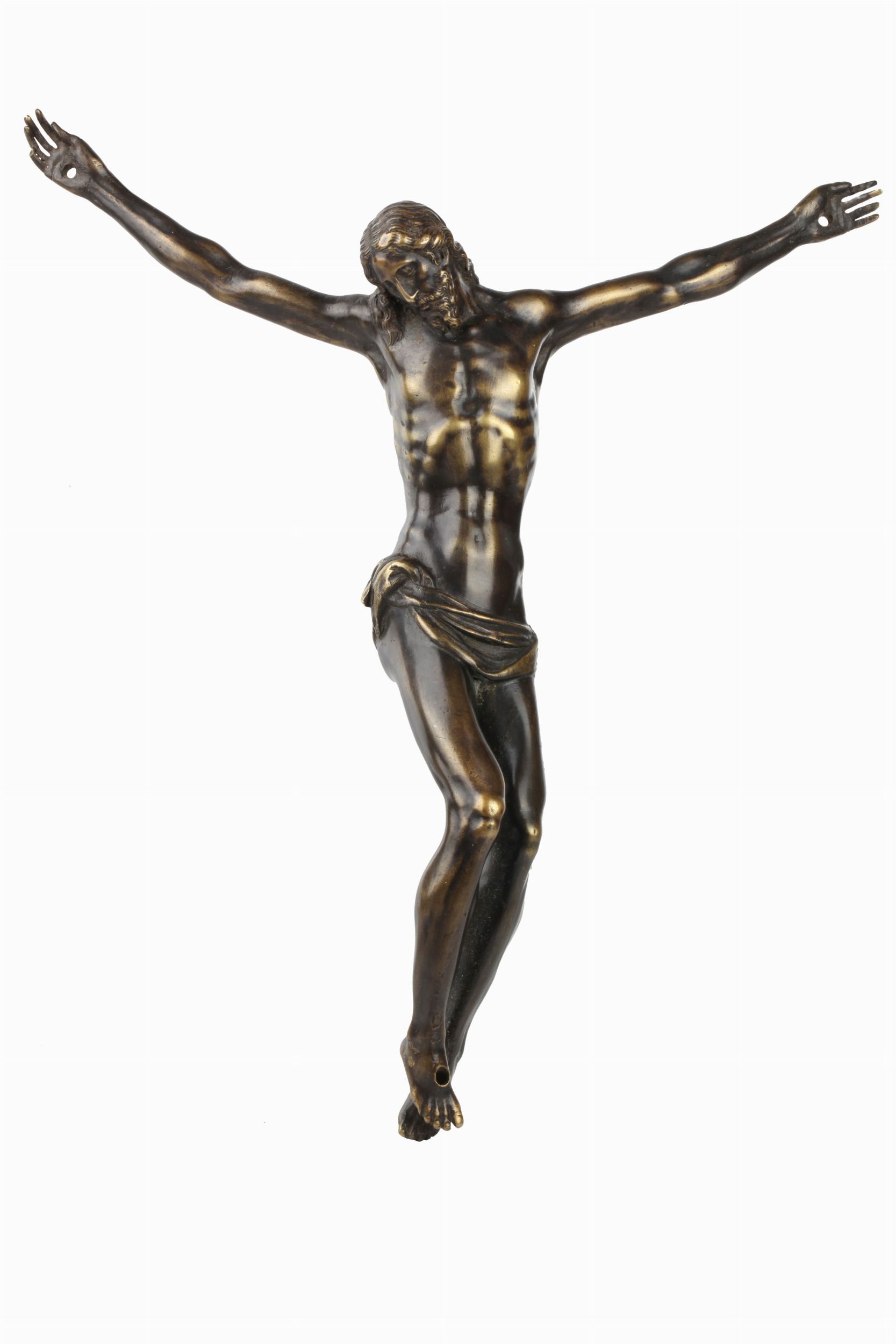 La tipologia che ha come suo primissimo modello il Crocefisso donato da Giambologna alle monache domenicane di Santa Maria degli Angiolini (vedi nella scheda del lotto numero 80 del presente catalogo l'elenco delle principali opere auliche di questo tipo, tutte di grandi dimensioni e risalenti alla fine del XVI secolo) presenta corpo piuttosto allungato, perizoma stretto molto tirato, annodato sul fianco destro, e una testa importante inanellata di capelli.