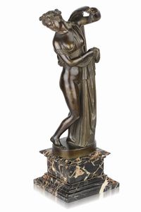 Bronzo patinato, Tot. 38,5x10x10 cm Bronzo 30x9x5,5 cm Veneto? XVI-XVII secolo Una mano sul seno e l'altra [..]