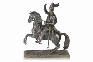 Bronzo patinato nero, 27x24x10,5 cm Scuola francese XIX secolo Enrico IV a cavallo sprona il suo esercito [..]