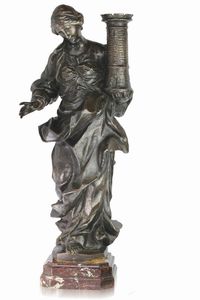 Bronzo patinato nero, Tot. 69,5x29x24 cm Bronzo 63x29x24 cm Anonimo scultore tardo barocco XVIII secolo Scultura [..]