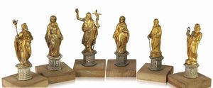 Bronzo dorato e argentato, Altezza media 14x4,5x3,5 cm Scuola Neoclassica XVIII-XIX secolo Gruppo di sei [..]