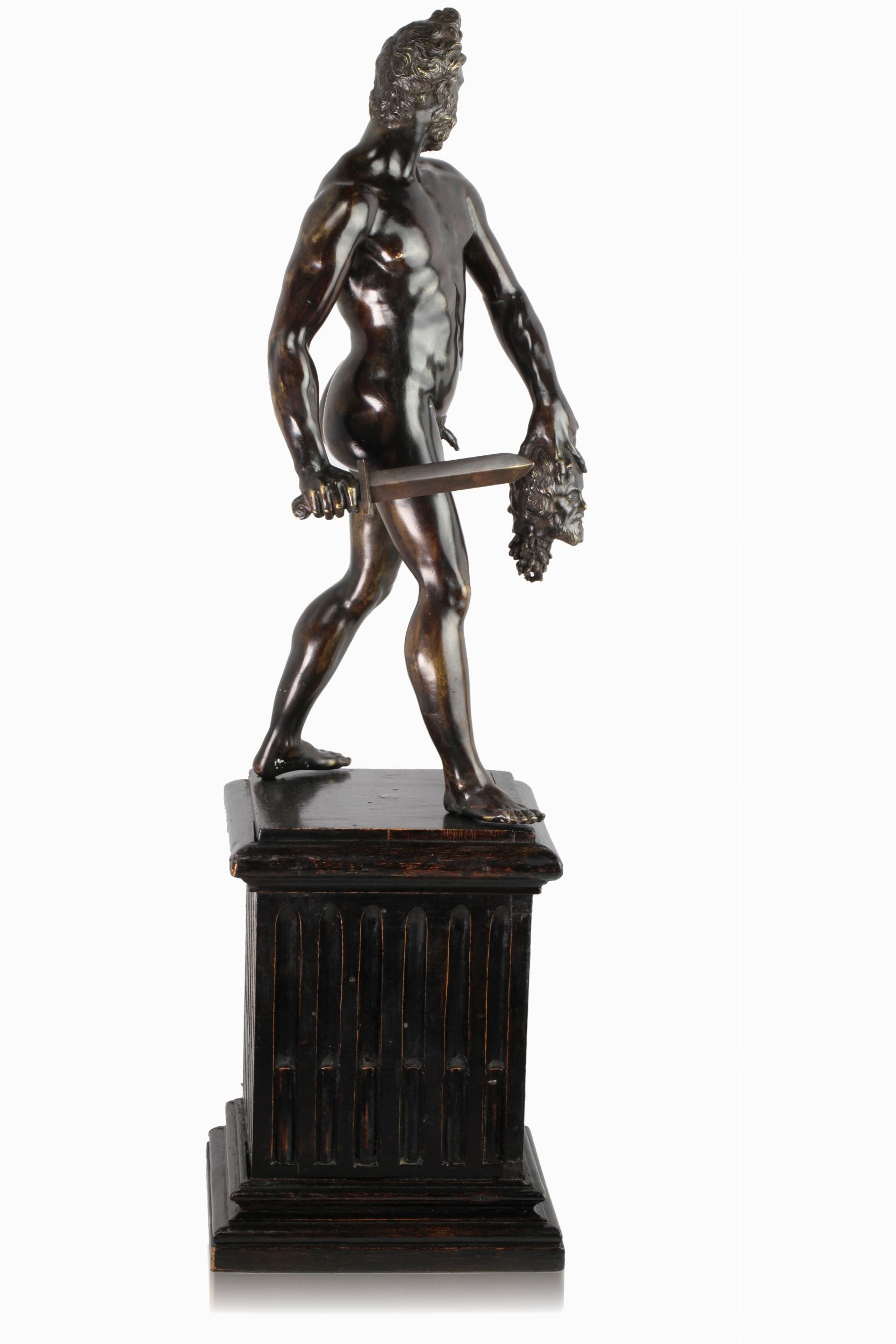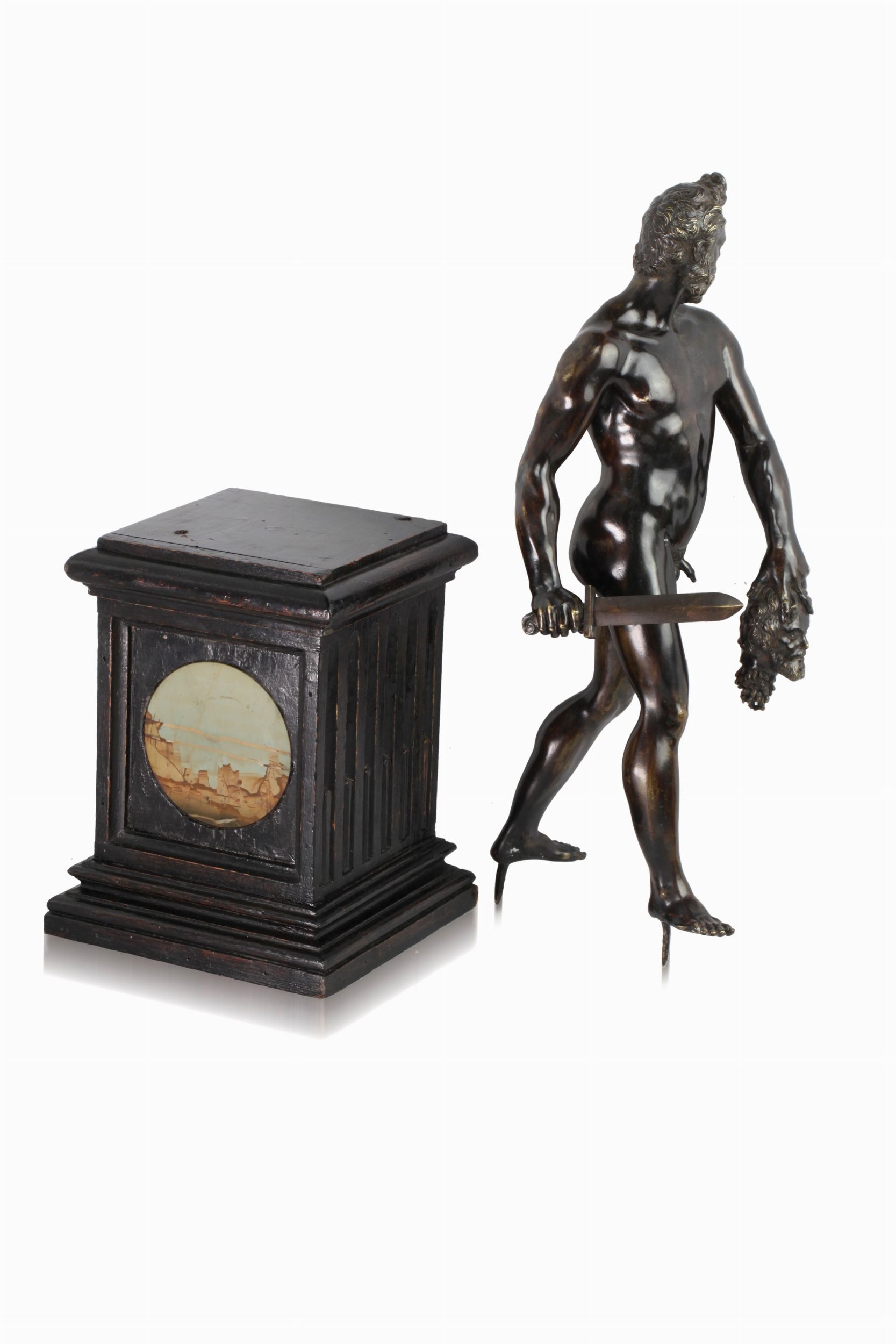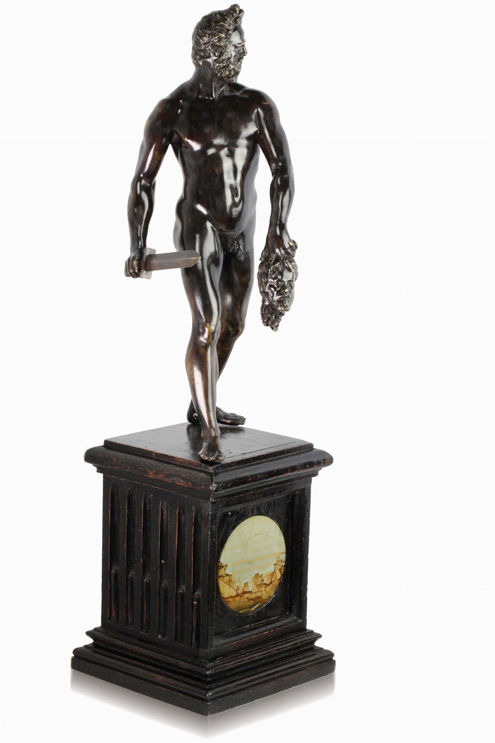 Attribuito a Massimiliano Soldani Benzi, il modello originale di questo bronzo appartiene alla collezione della National Gallery of Ireland di Dublino(n.8122). Raffigura un uomo nudo che incede tenendo nella mano sinistra una testa mozzata, verosimilmente quella del Battista.