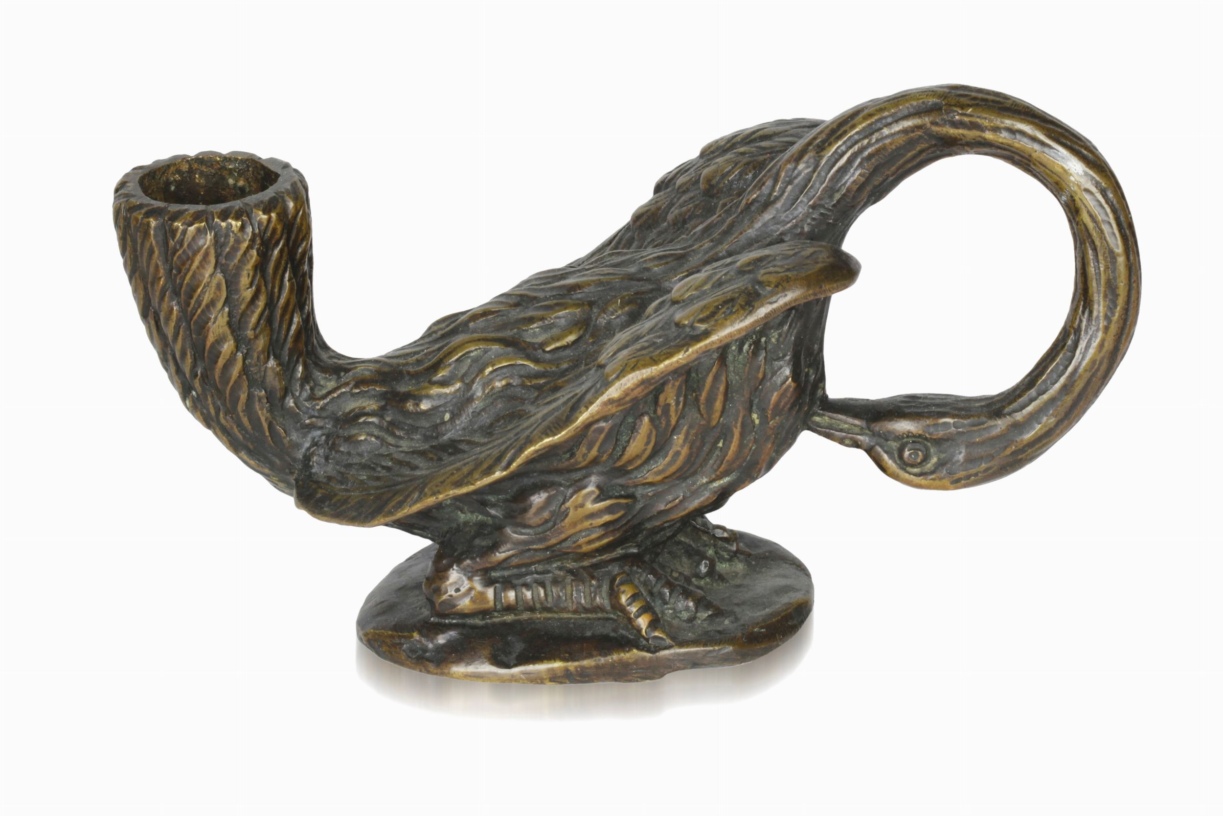 Questo curioso candeliere ripete inequivocabilmente l'invenzione di una lucerna custodita al Bode Museum di Berlino: un pellicano con coda porta-stoppino e collo arcuato a formare il manico dell'oggetto.