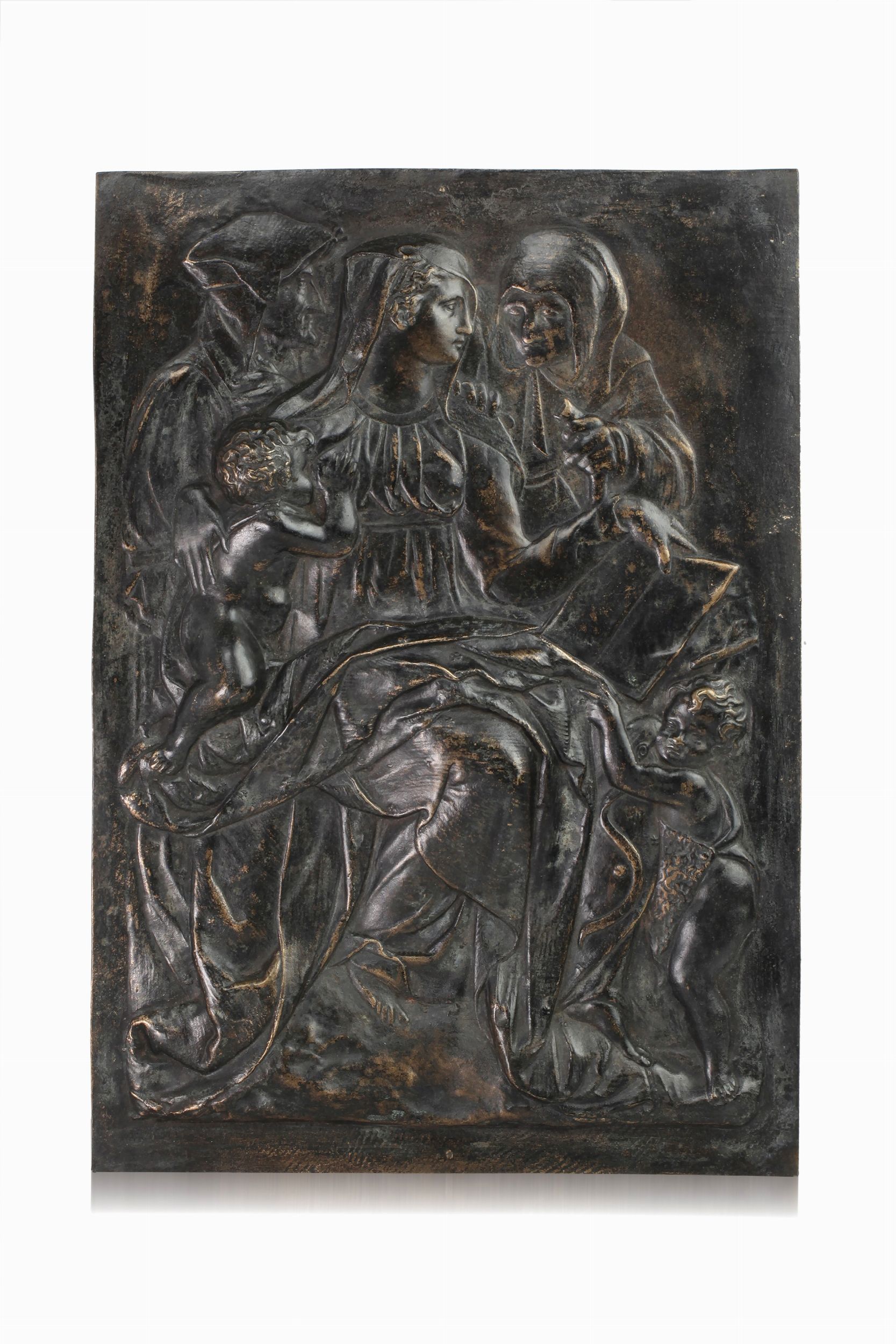 Grande placca realizzata in bassorilievo, raffigurante la Madonna seduta di profilo con il Bimbo in grembo, San Giovanni Battista bambino, Sant'Anna e, sullo sfondo, il profilo di un patrono.