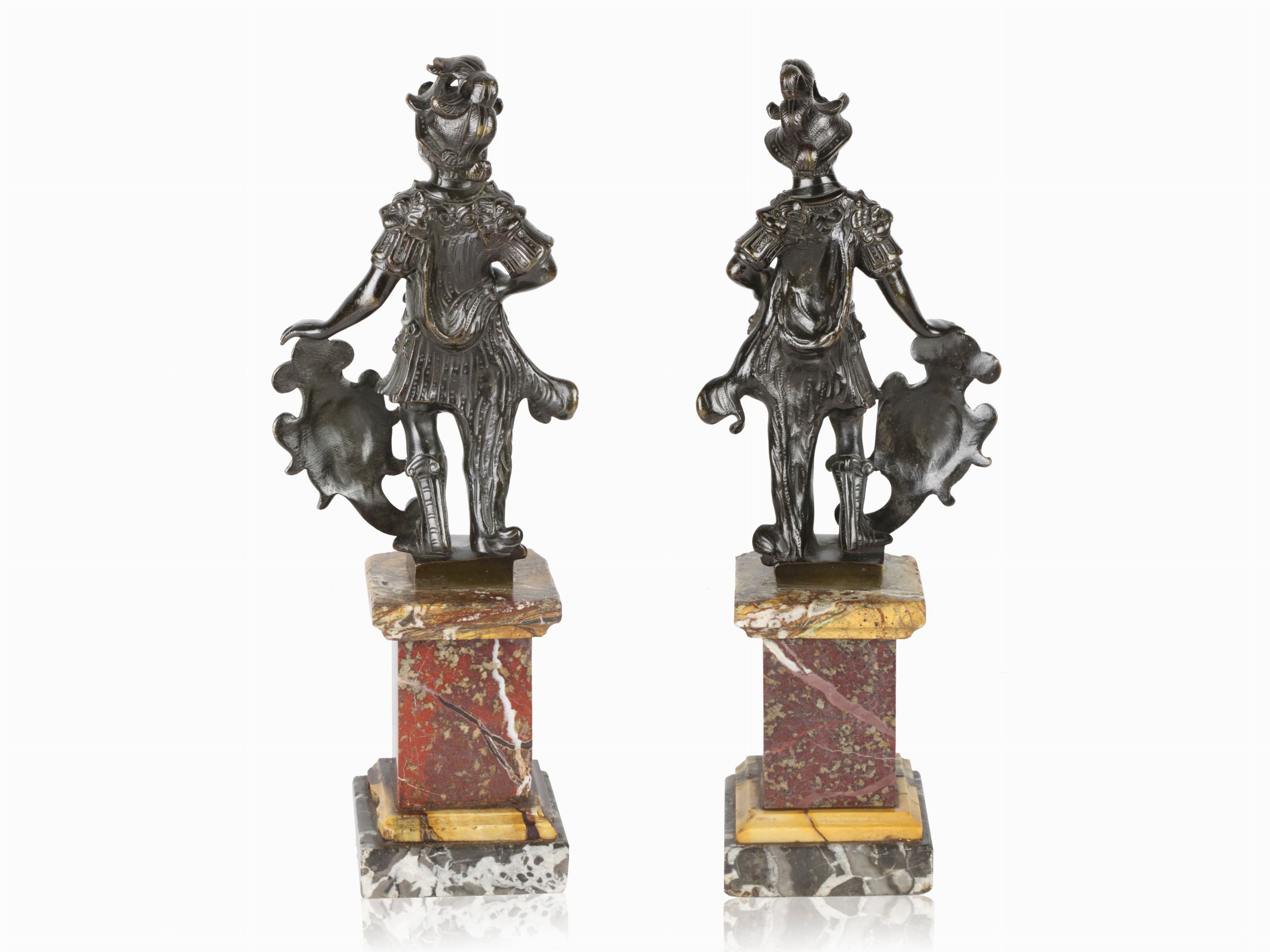 Una rara coppia di armigeri reggiscudo che si potrebbero vedere affiancati, in marmo, a vigilare su qualche portale antico.