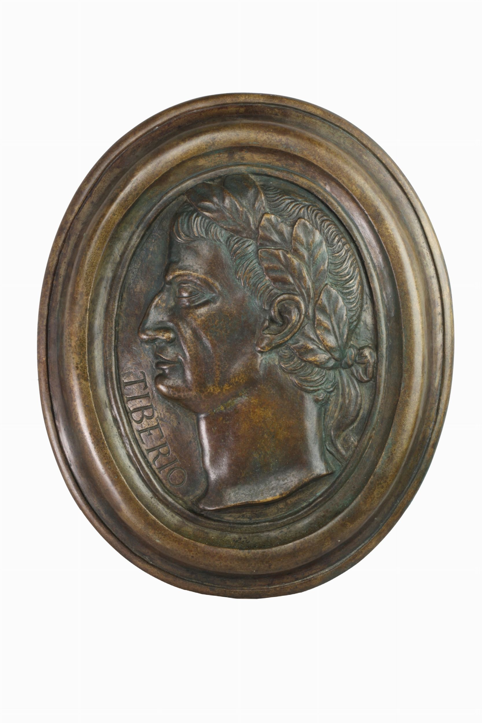 Classico medaglione ovale raffigurante il profilo di un imperatore romano, nel caso specifico Tiberio (42 A.C.-37 D.C.).